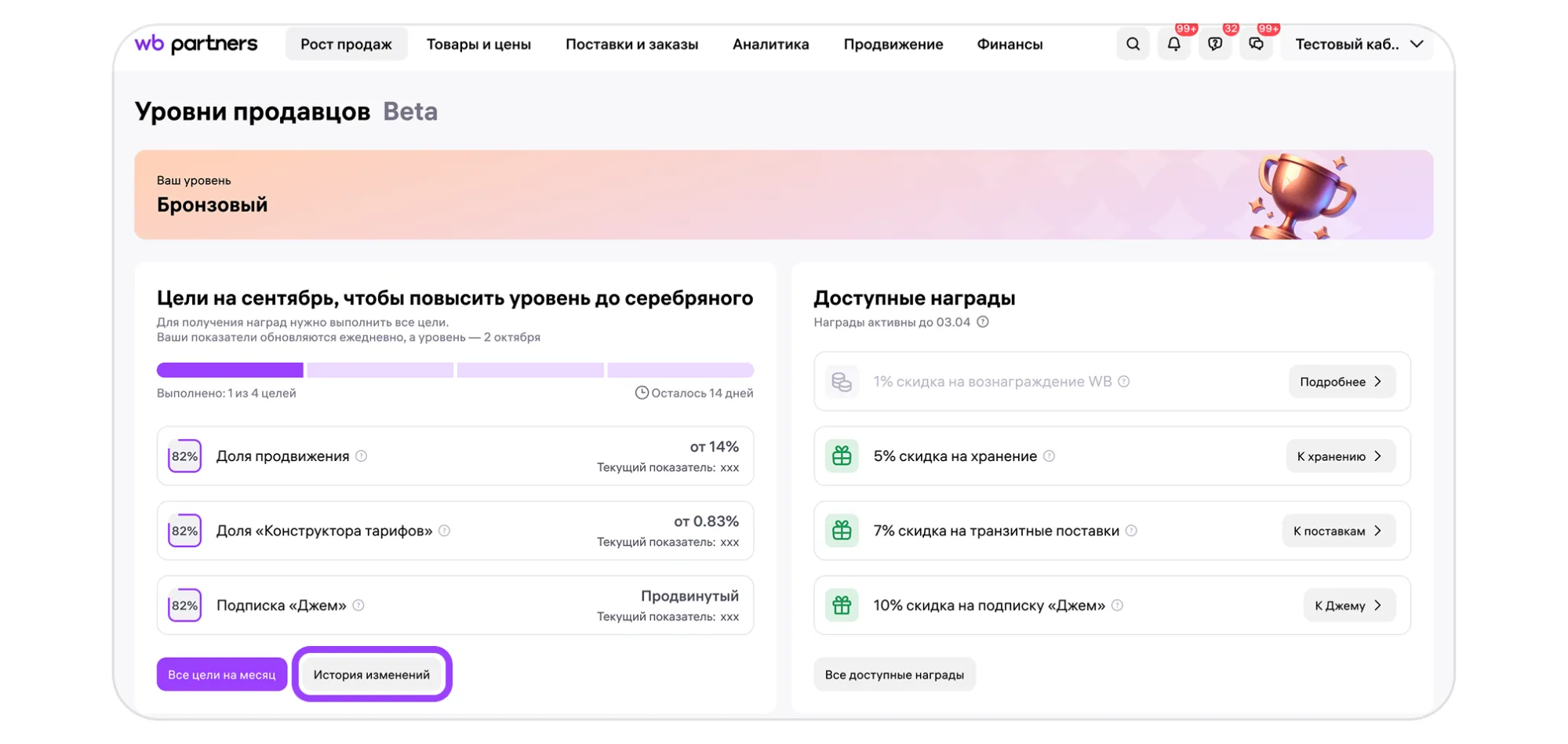Программа «Уровни продавцов» начнёт действовать с 1 декабря. Она заменит программу лояльности — ноябрь станет последним месяцем её работы. Посмотреть цели и результаты их выполнения по старой программе можно в разделе «Рост продаж» → Программа «Уровни продавцов» → История изменений.