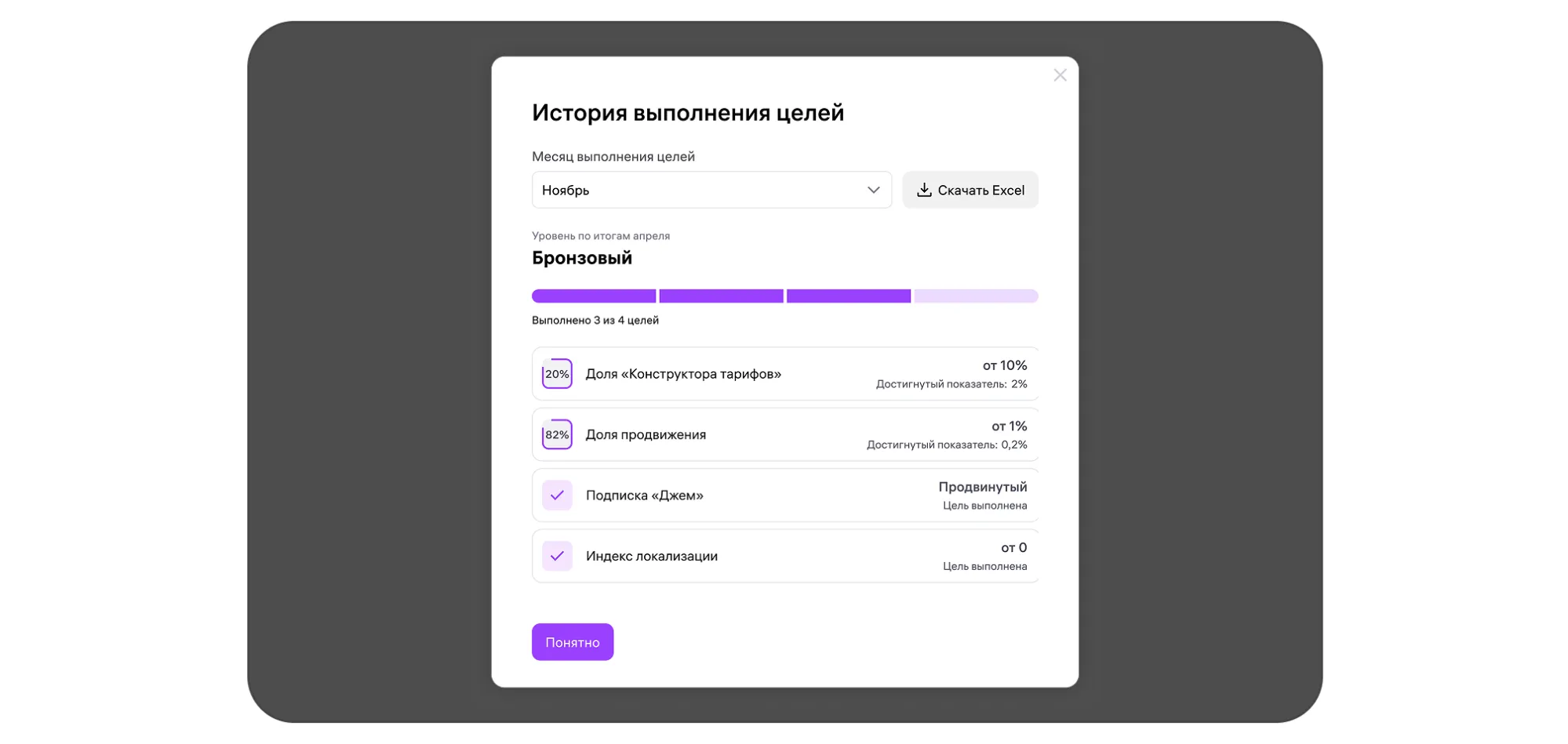 Например, в декабре вы были на «Бронзовом» уровне, но за месяц выполнили цели не только для «Серебряного», но и для «Золотого». Тогда в январе подключим сразу «Золотой» уровень.