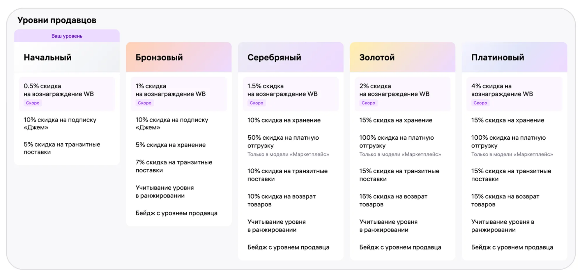 «Уровни продавцов» — программа для продавцов, которая даёт доступ к дополнительным льготам, инструментам роста и поддержке Wildberries. Чем выше уровень — тем больше поощрений. Программа действует для продавцов Wildberries из России.