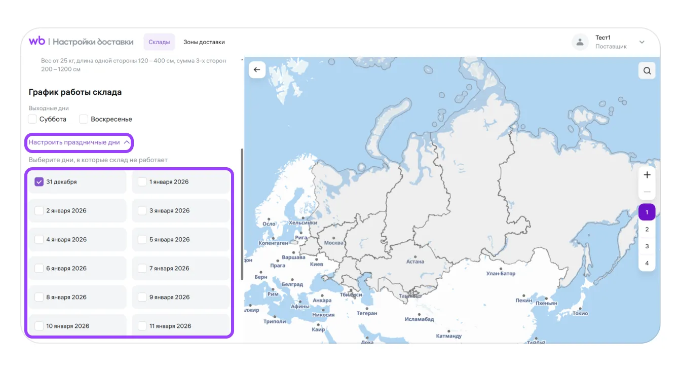 Праздничные дни, которые вы отметили, будут отображаться в настройках склада. Покупатели не смогут оформить заказ на эти даты.