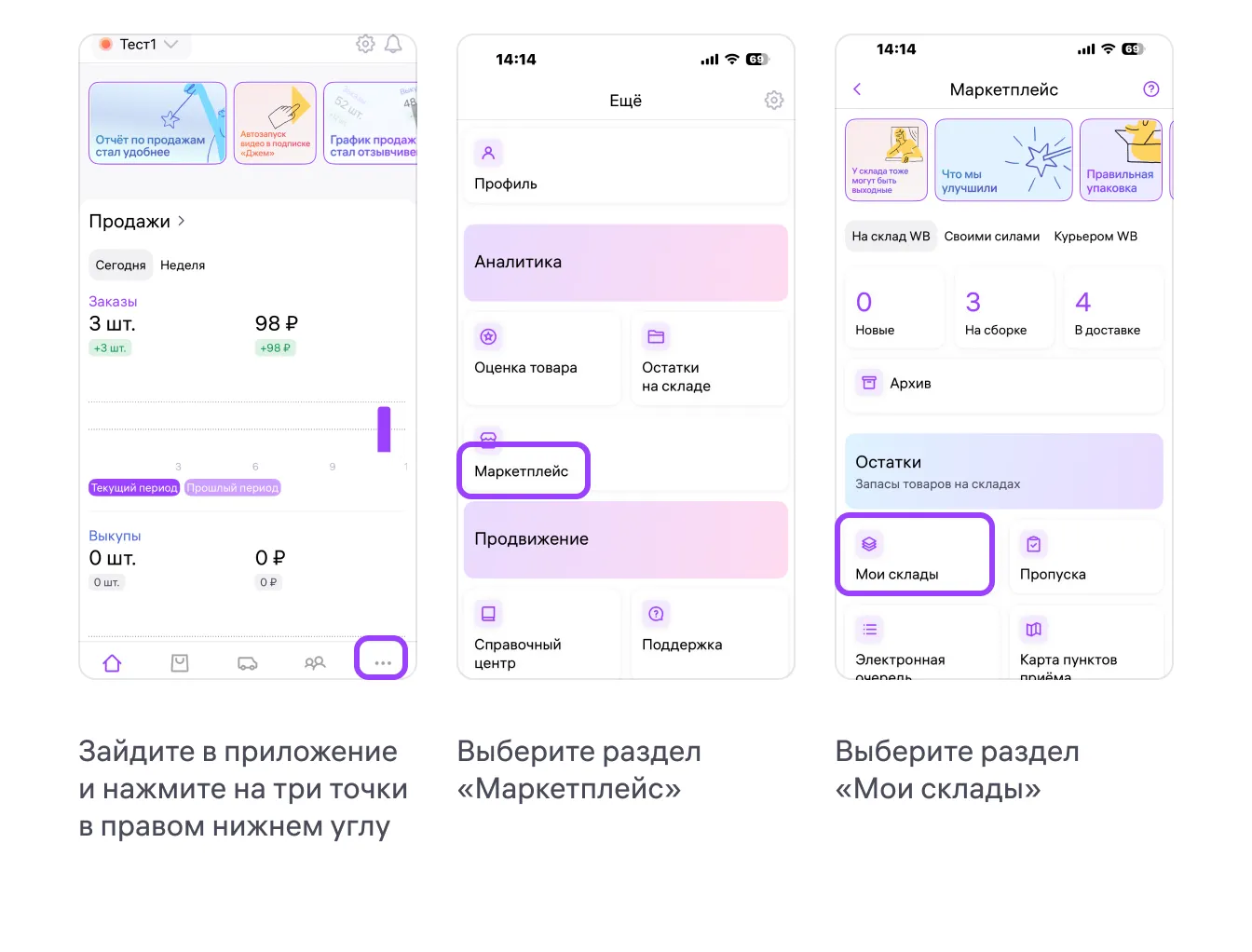 Чтобы удалить склад в мобильном приложении, зайдите в раздел «Мои склады», как указано на изображениях ниже.