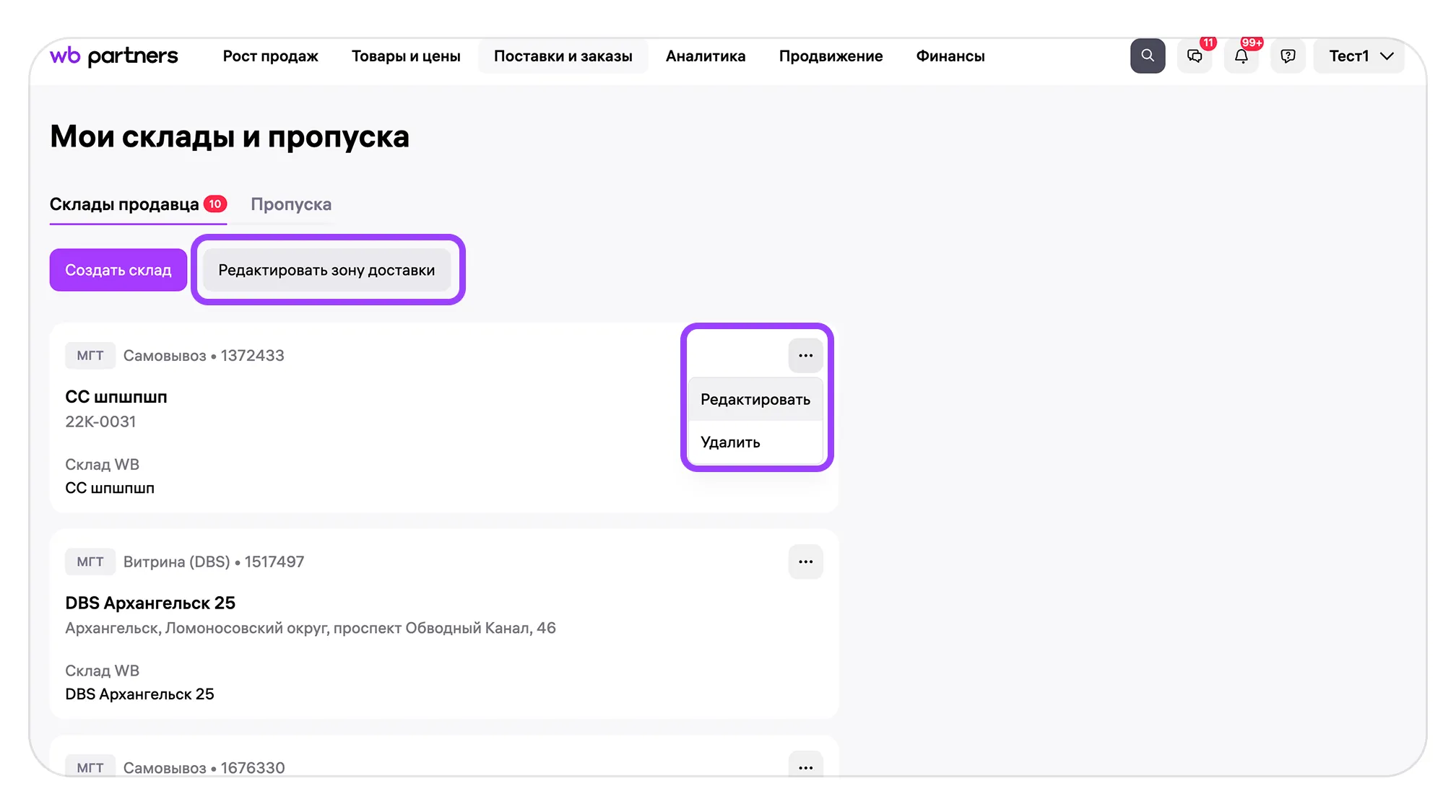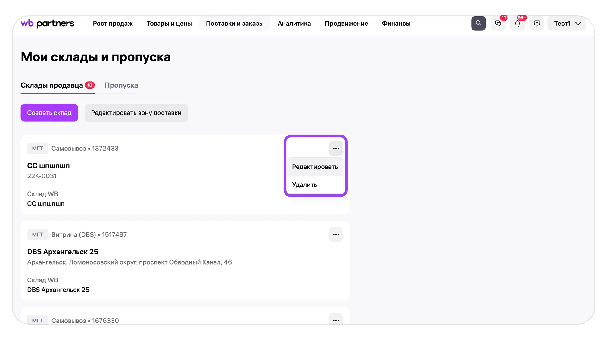 Чтобы отредактировать информацию о каком-то конкретном складе, нажмите на три точки и выберите «Редактировать».