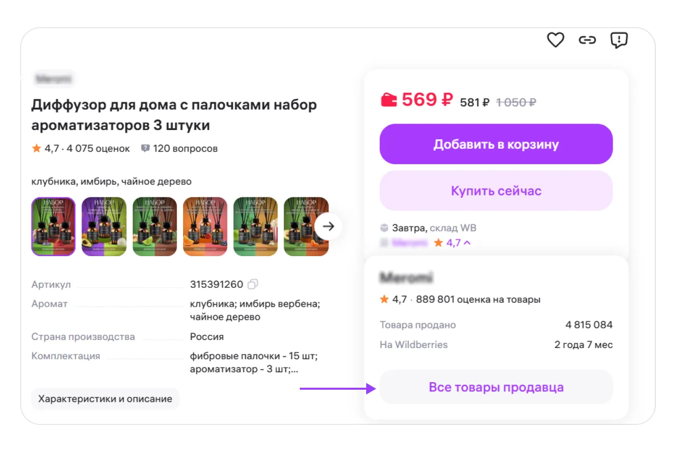 Покупатели могут попасть на эту страницу из карточки товара, нажав «Все товары продавца».