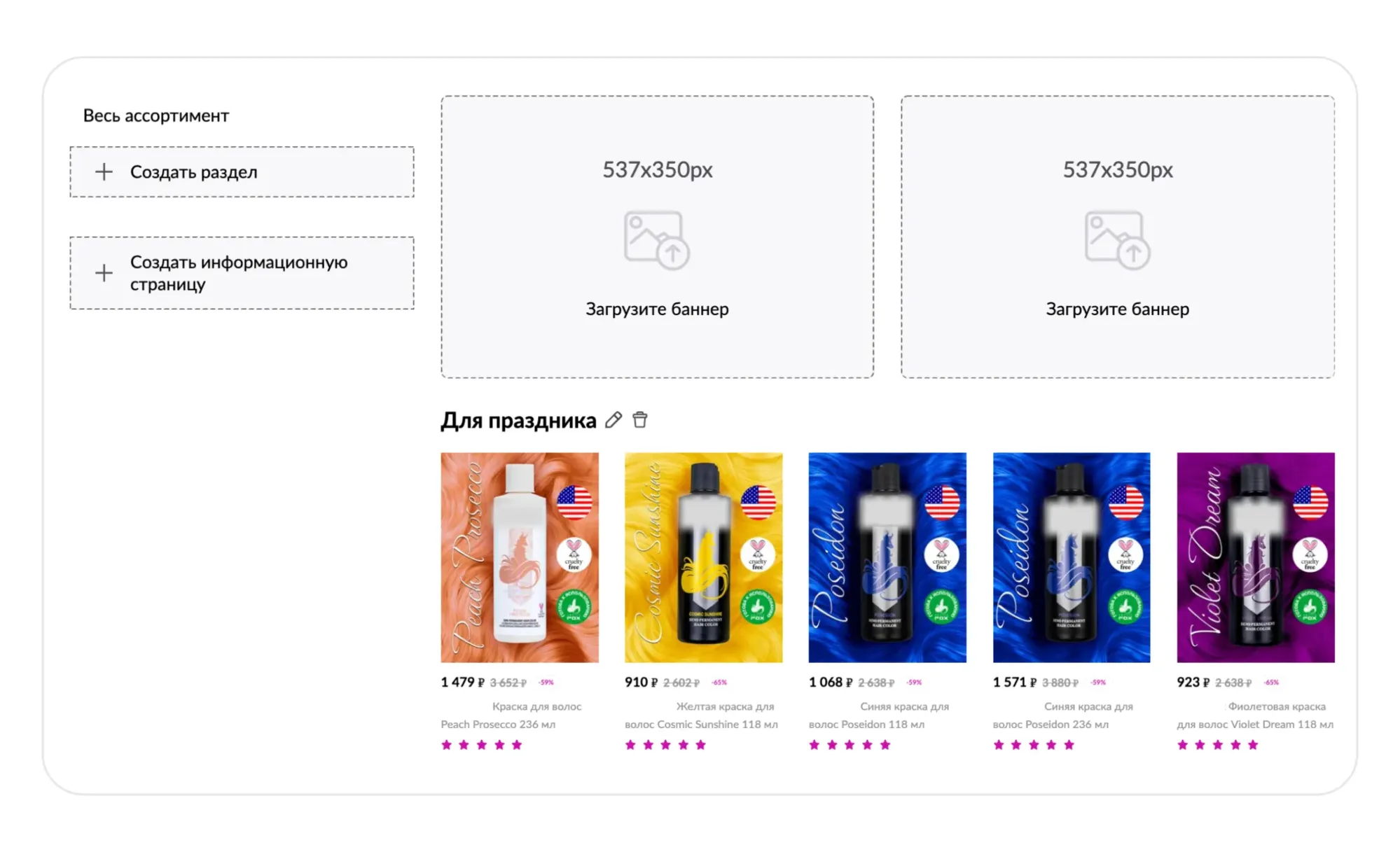 Подборки товаров. Тематические блоки с товарами: скидки, новинки, бестселлеры, товары с высоким рейтингом или собственные подборки. Они размещаются в виде каруселей и помогают выделить то, что вам важно продвигать. Можно одновременно показывать до трёх подборок.