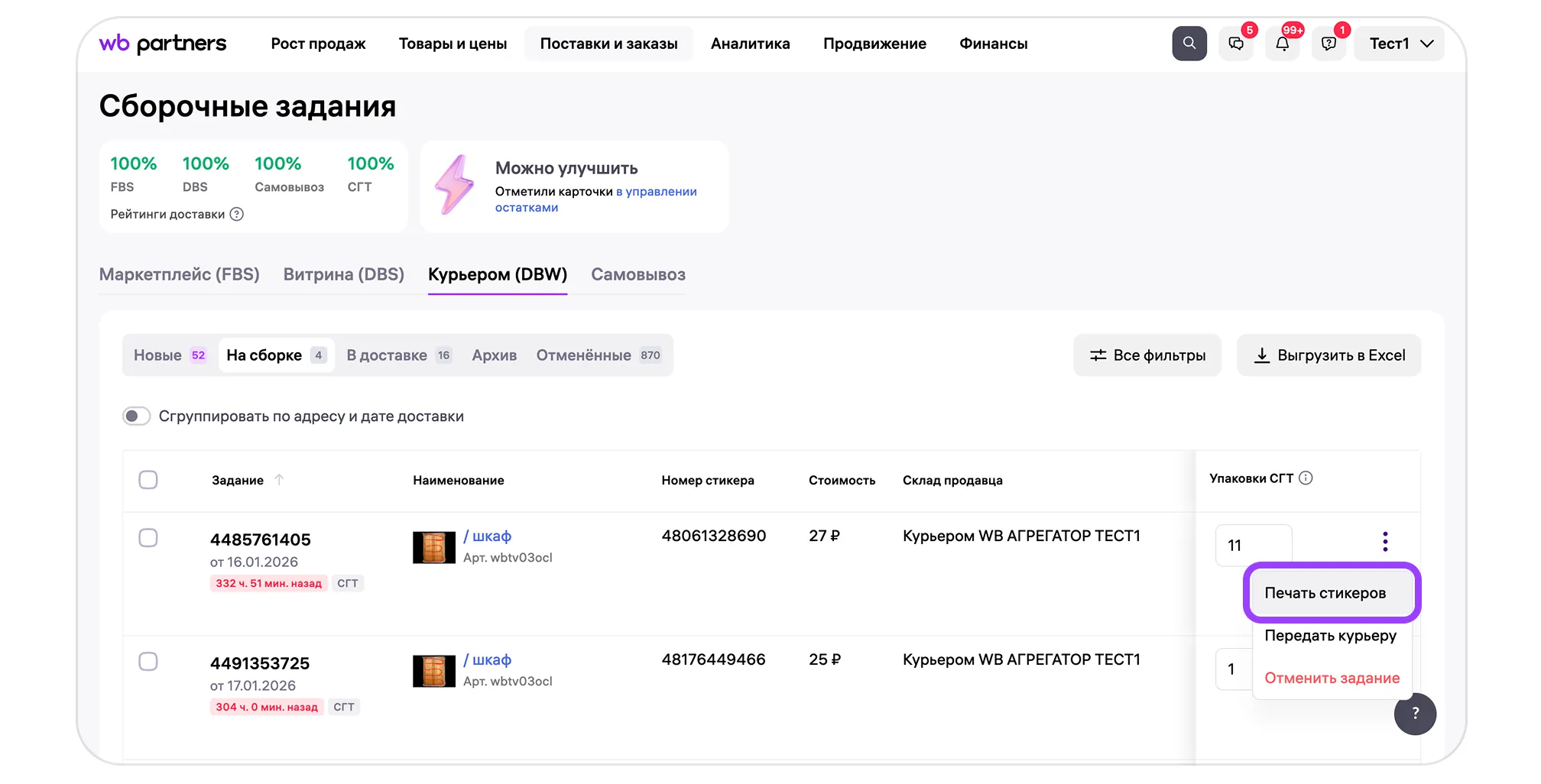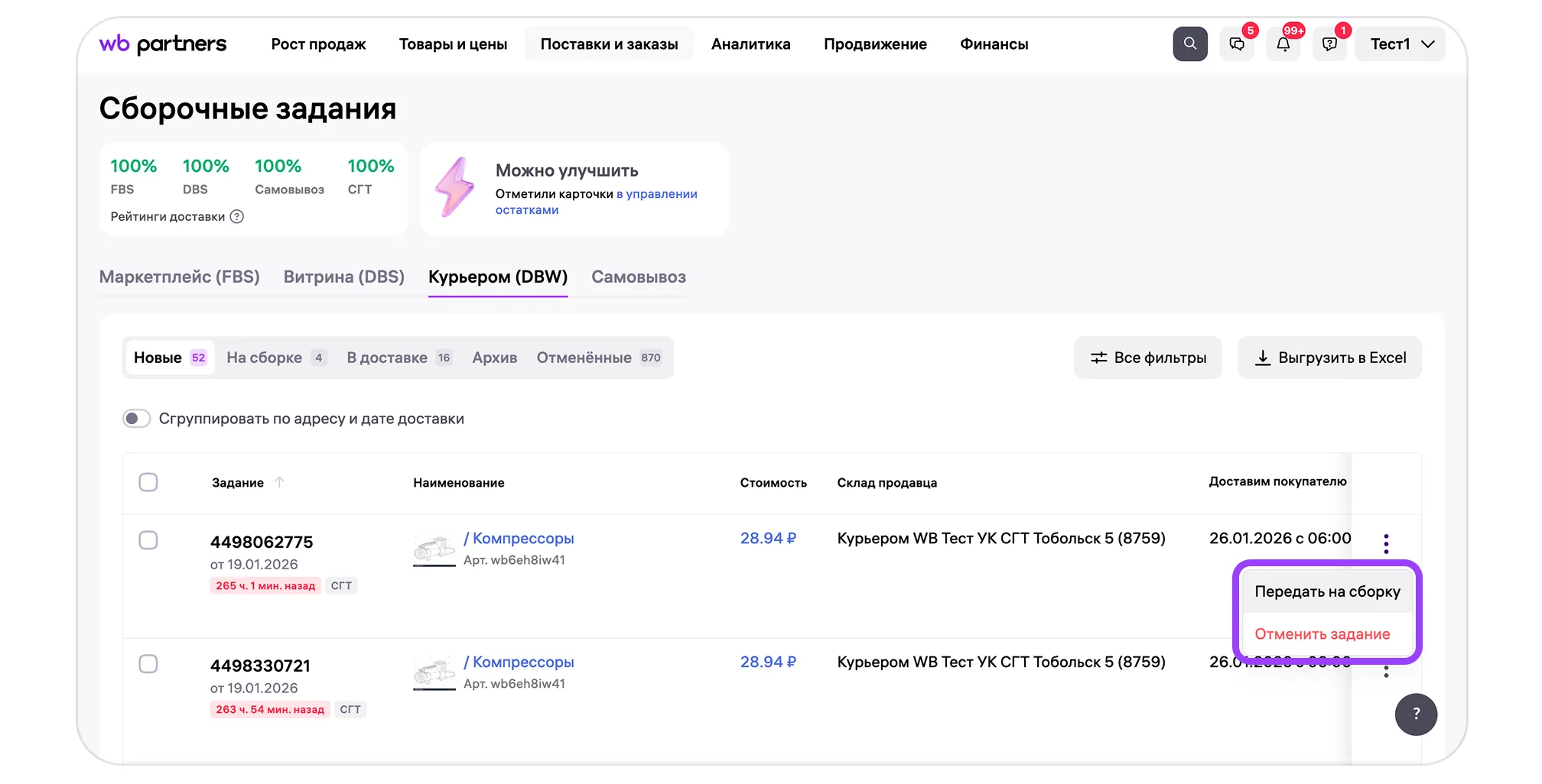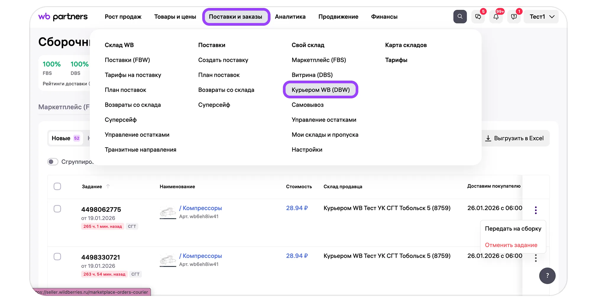 Как только покупатель оформит заказ на ваш товар, в разделе «Сборочные задания» появится новое задание для сборки и доставки товара. Чтобы попасть в раздел, нажмите в верхнем меню портала Поставки и заказы → Курьером WB (DBW).