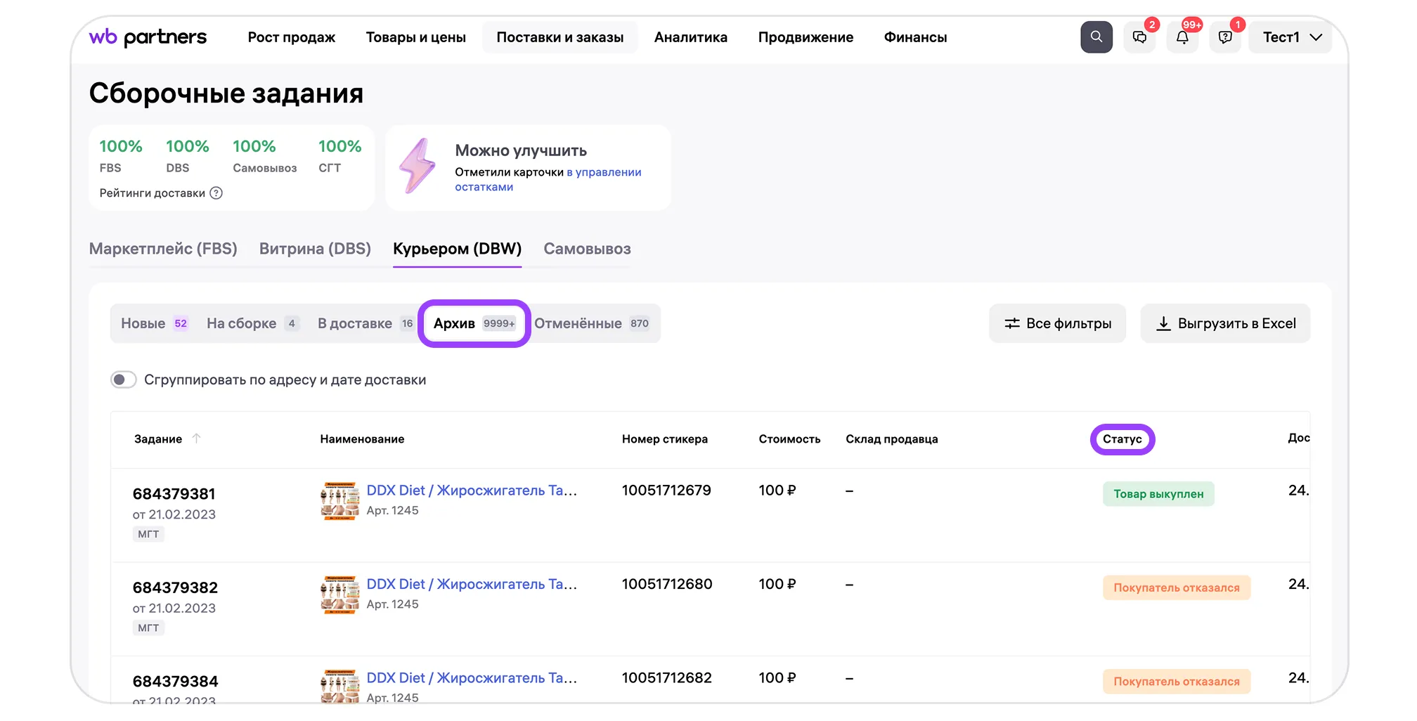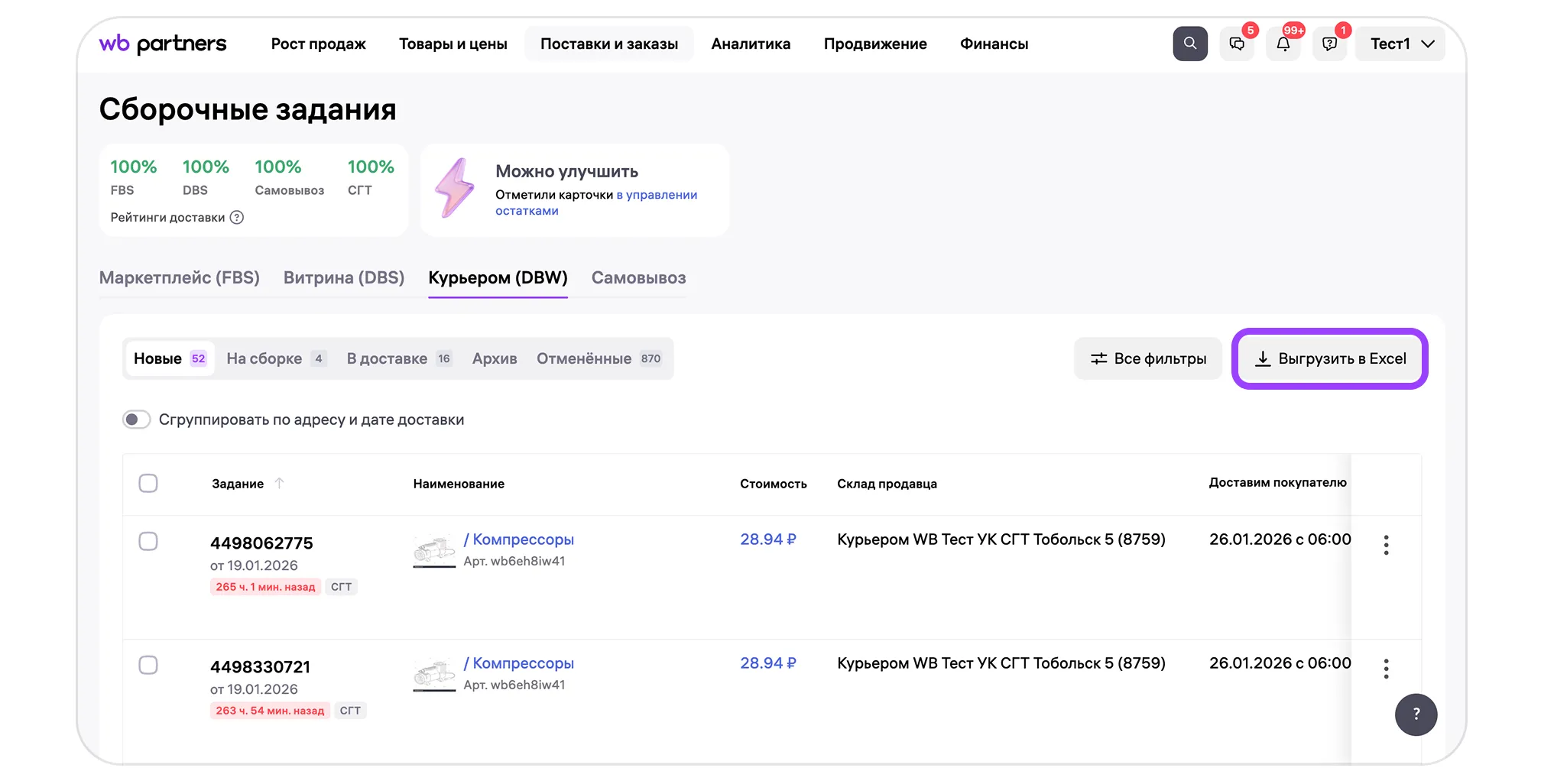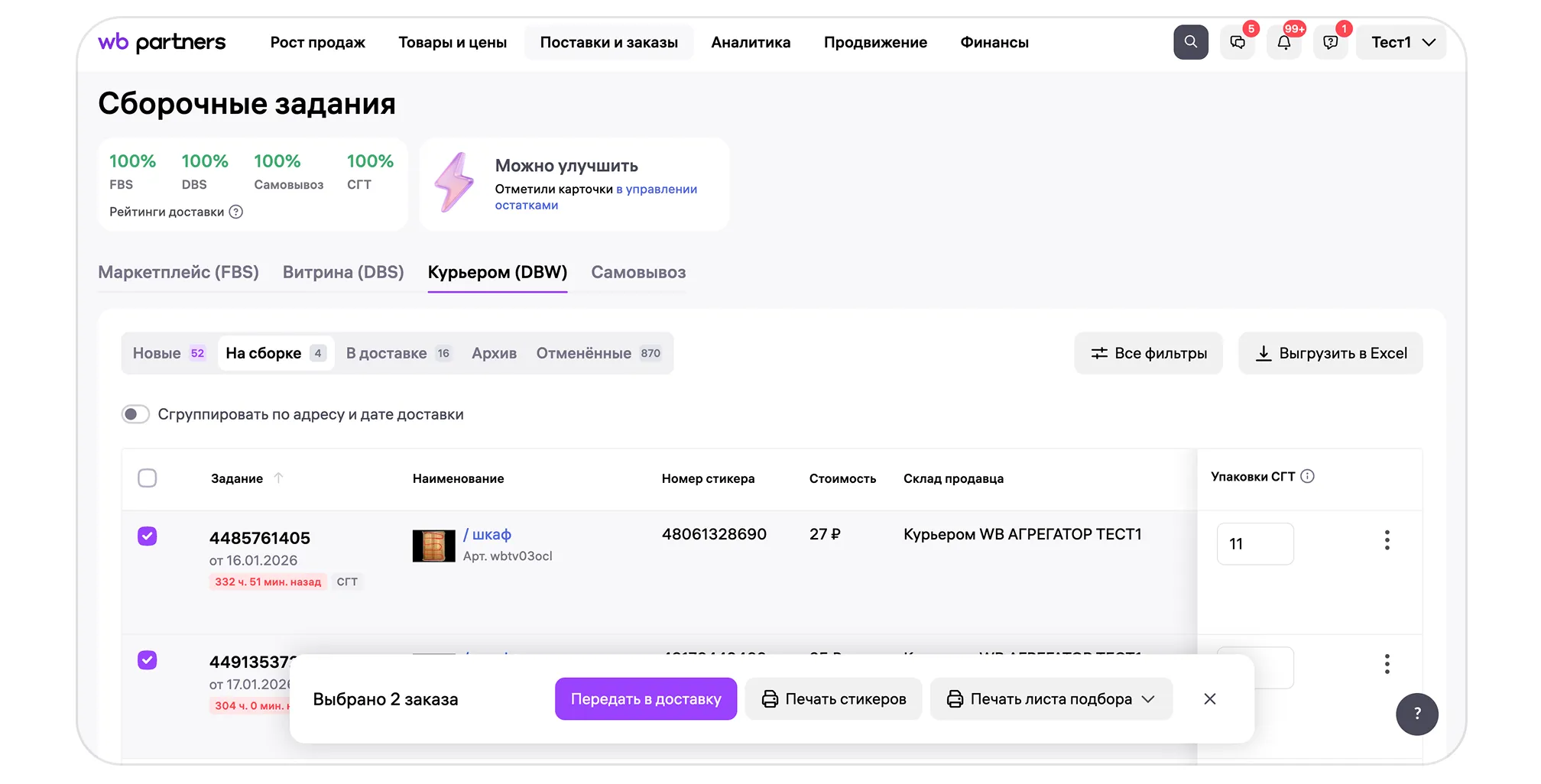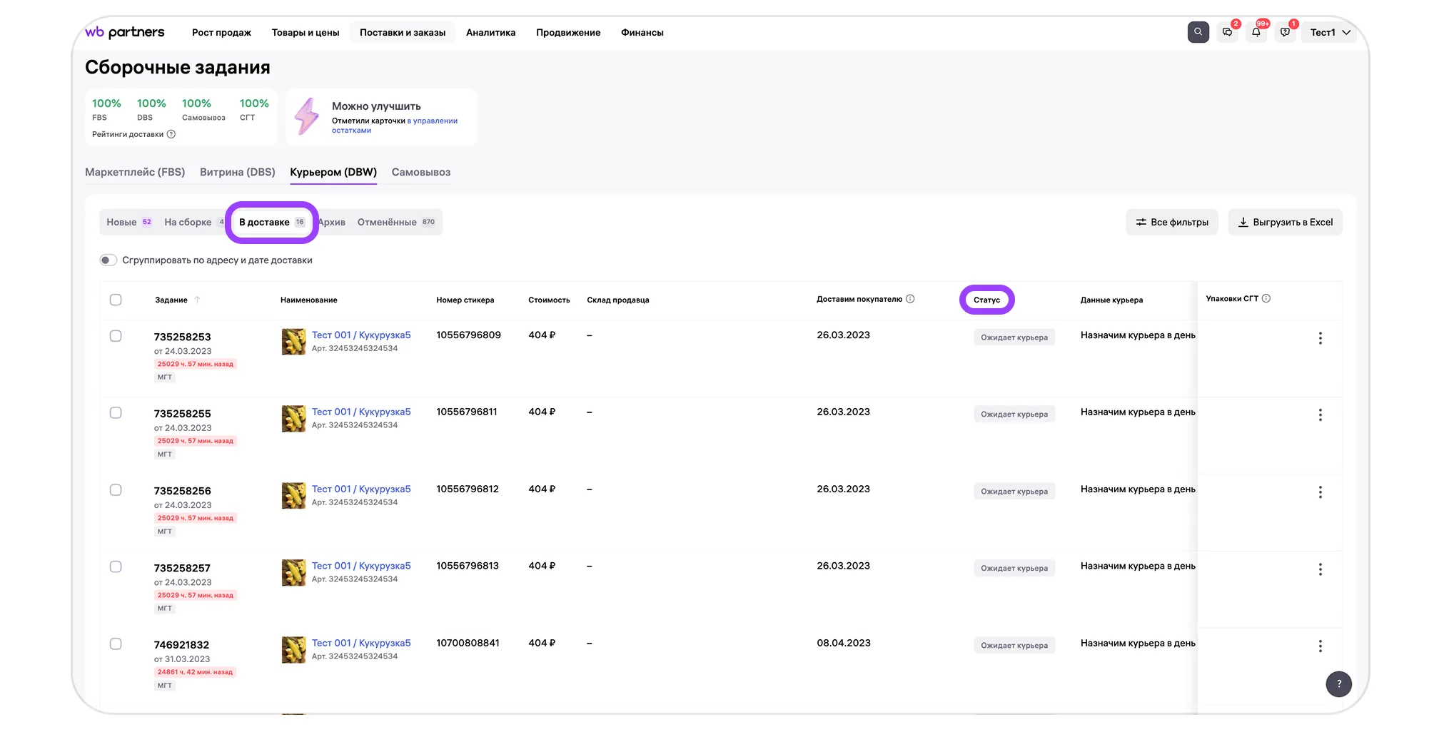 Как только покупатель оформит заказ на ваш товар, в разделе «Сборочные задания» появится новое задание для сборки и доставки товара. Чтобы попасть в раздел, нажмите в верхнем меню портала Поставки и заказы → Курьером WB (DBW).
