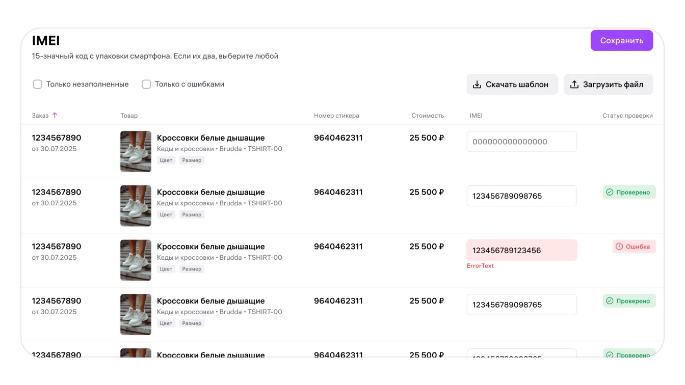 Откроется страница с заказами, для которых он нужен. Введите уникальное значение в поле «IMEI». Нажмите «Сохранить».