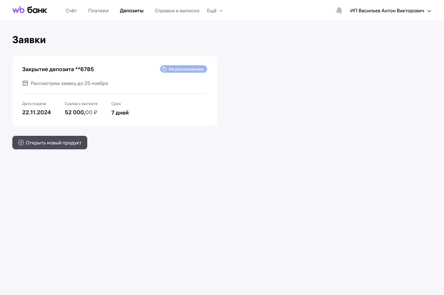 Если у вас уже есть открытые депозитные продукты банка или заявки, нажмите «Открыть новый продукт».
