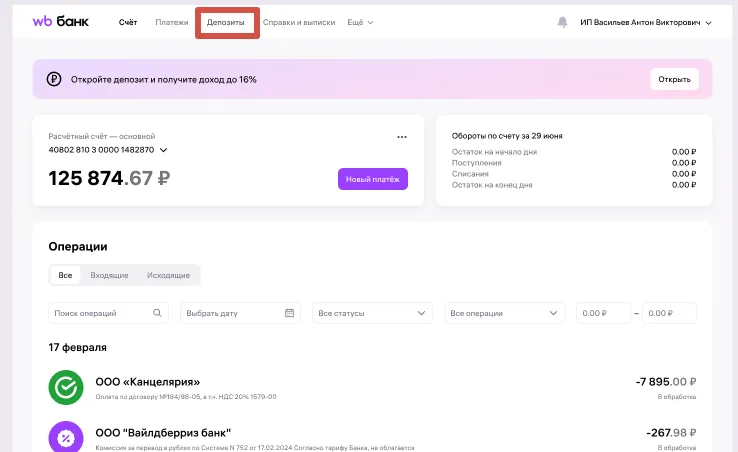 Чтобы открыть депозит в личном кабинете WB Банка, выберите вкладку «Депозиты» в главном меню.