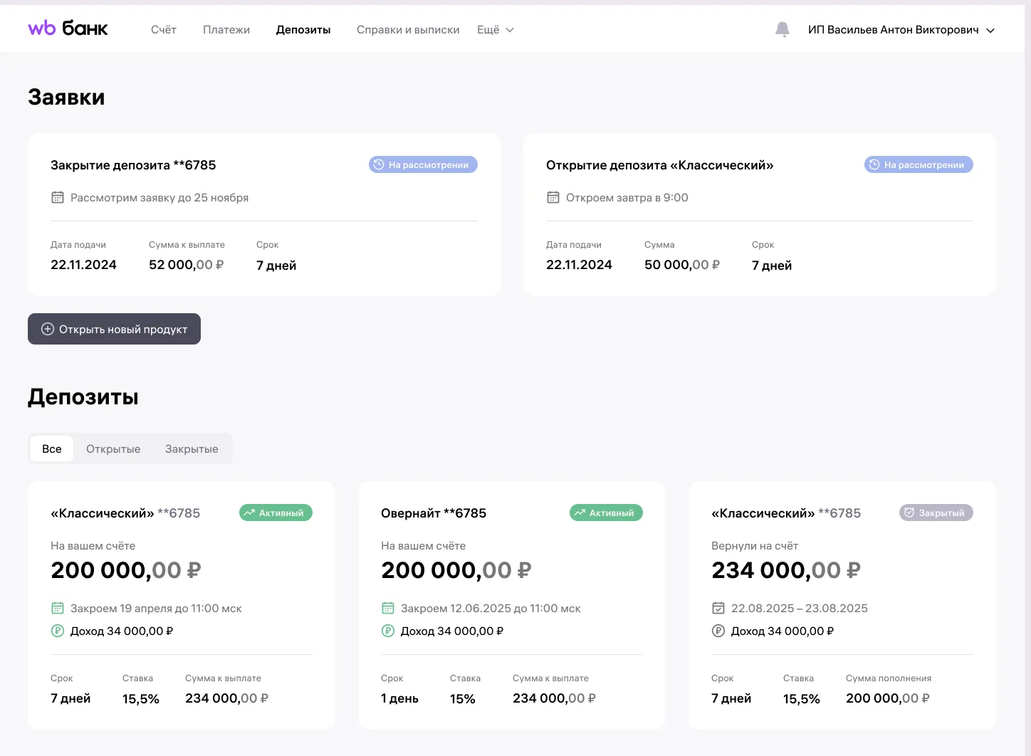 Чтобы открыть депозитный продукт, необходимо открыть расчетный счёт в ООО «Вайлдберриз Банк» и иметь активный личный кабинет в интернет-банке — ДБО Faktura или ДБО WB Банк.