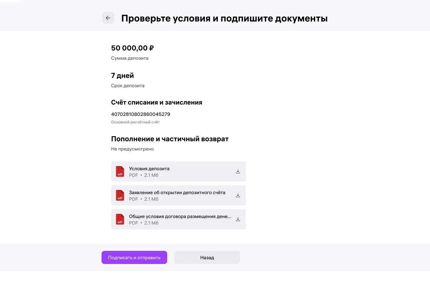 Сформируется электронная форма заявки на размещение депозита, которую необходимо подписать кодом — он придёт в СМС-сообщении. После того как вы подпишете заявку, она отправится в банк.