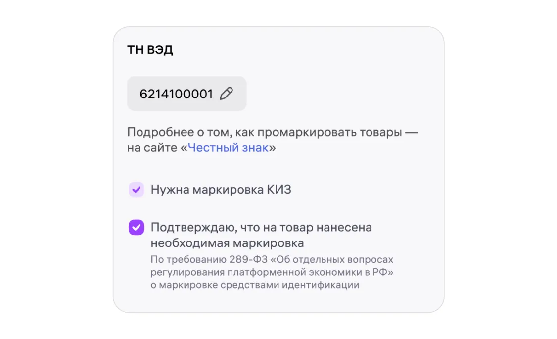 Чтобы выполнить подпункт «в» части 1 статьи 7 этого закона, мы сделали чекбокс «Подтверждаю, что на товар нанесена необходимая маркировка». Ставя в нём галочку, продавец подтверждает, что промаркировал товар в соответствии с законодательством России.