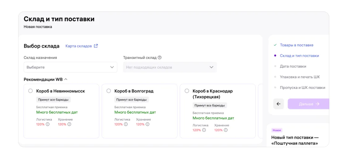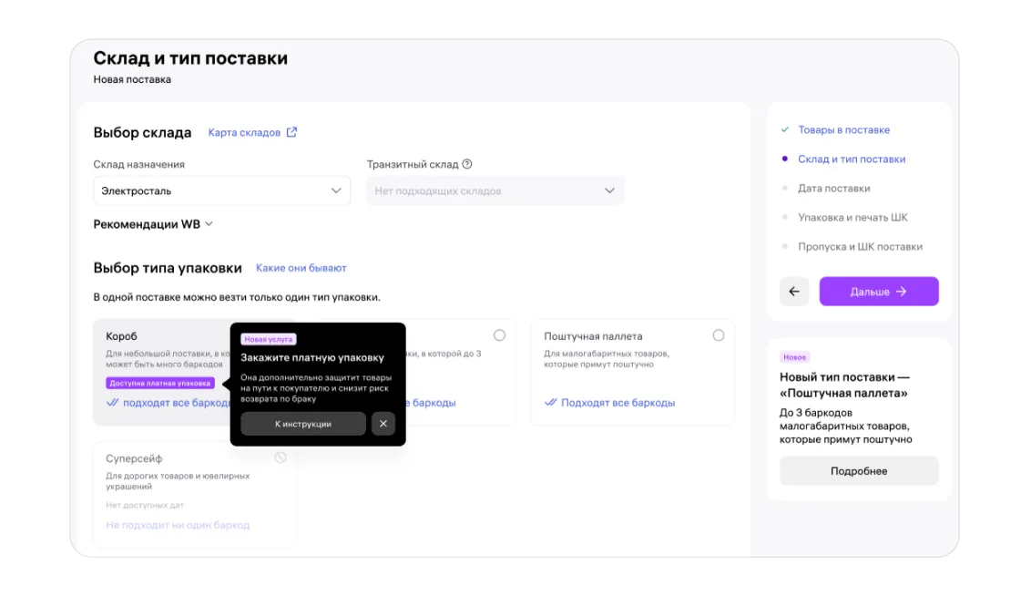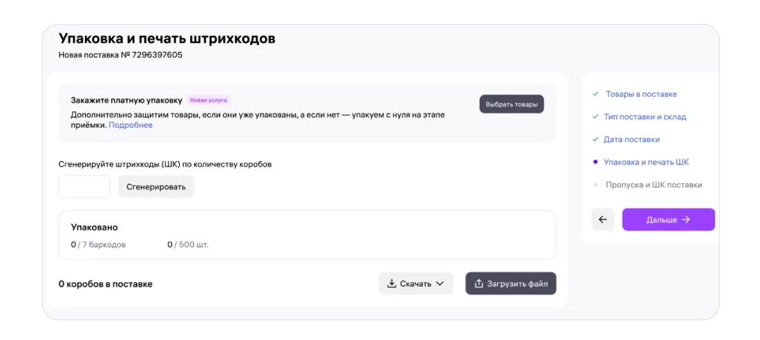 Услуга платная: добавьте товары в поставку, распределите по коробам — и мы подскажем, сколько спишем за упаковку того или иного артикула.