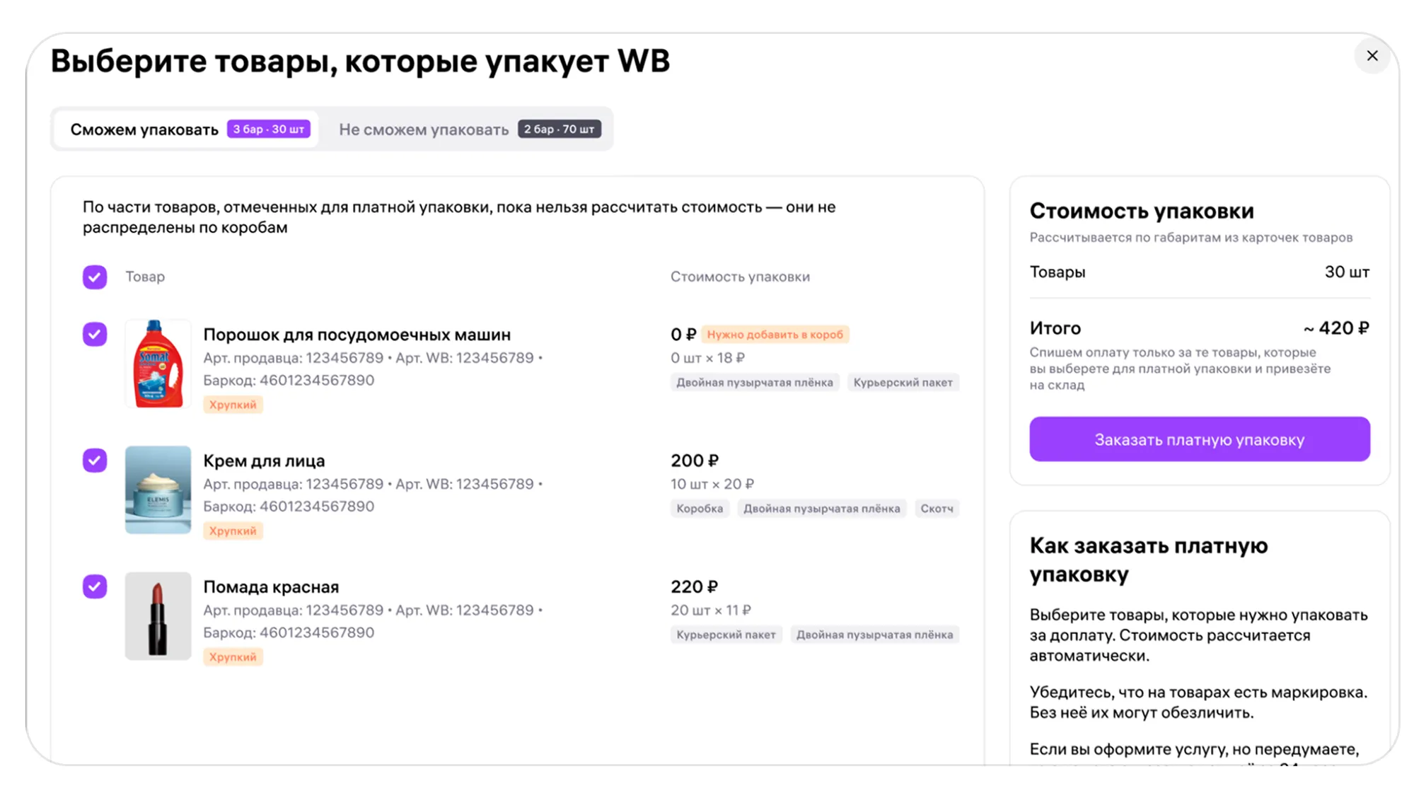 Например, если вы добавили в поставку 100 единиц одного артикула, не получится упаковать 50 из них платно, а другие 50 — самостоятельно.
