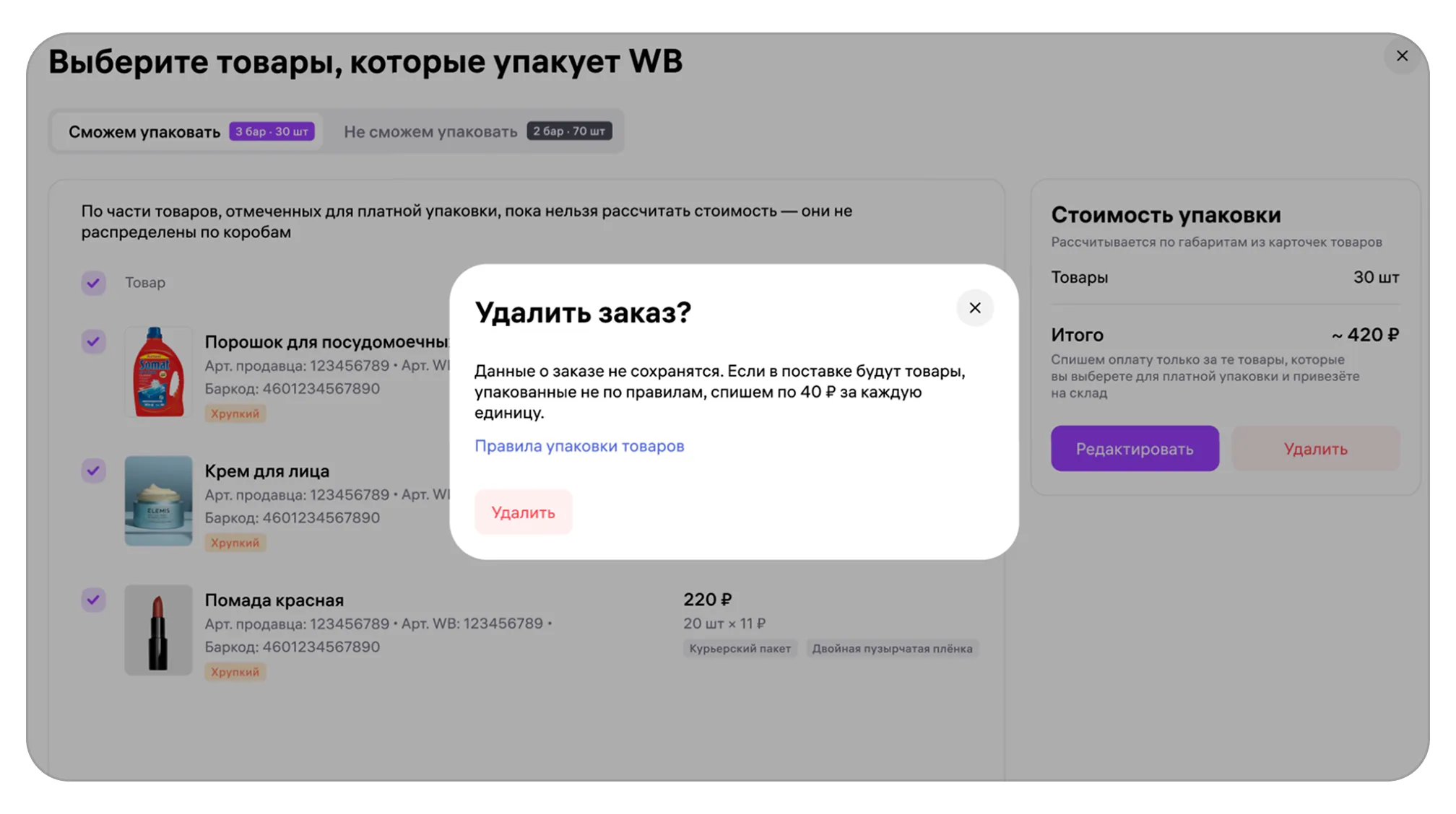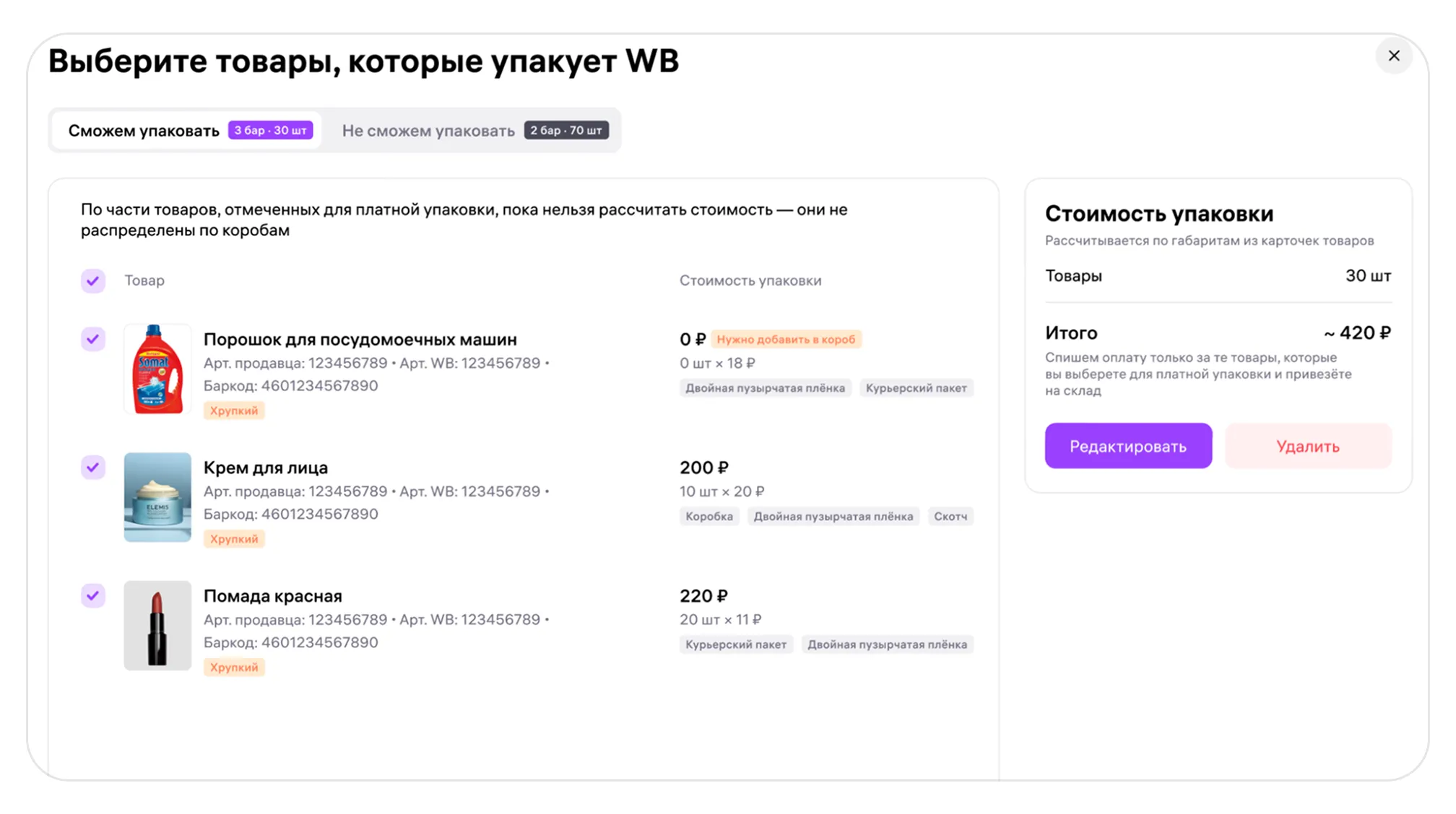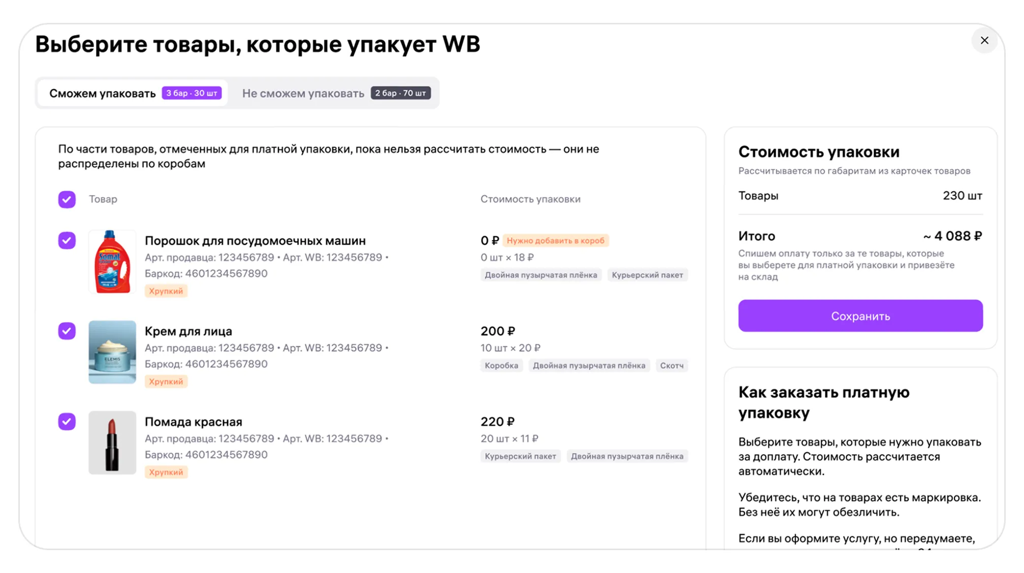 Если сотрудники склада не смогут принять какие-то товары — например, не получилось считать маркировку, — мы пересчитаем стоимость упаковки. Спишем деньги за услугу, только если товар упакуют и примут.