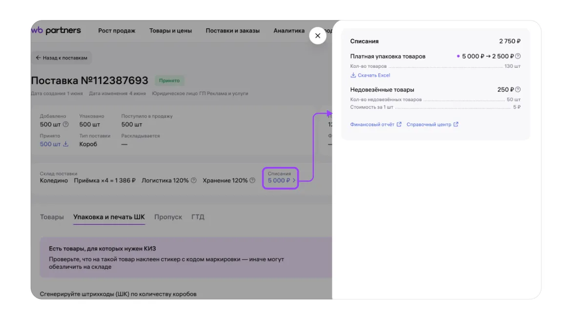 Деньги с баланса спишем после приёмки. Итоговую стоимость смотрите в финансовом отчёте — в столбце «Обоснование для оплаты» выберите значение «Услуга за платную переупаковку товара».