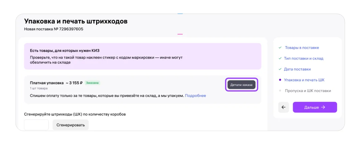 Когда вы сформируете заказ на платную упаковку, его можно будет отредактировать или удалить. Для этого вернитесь на этап упаковки и печати штрихкодов и нажмите «Детали заказа» на баннере платной упаковки: