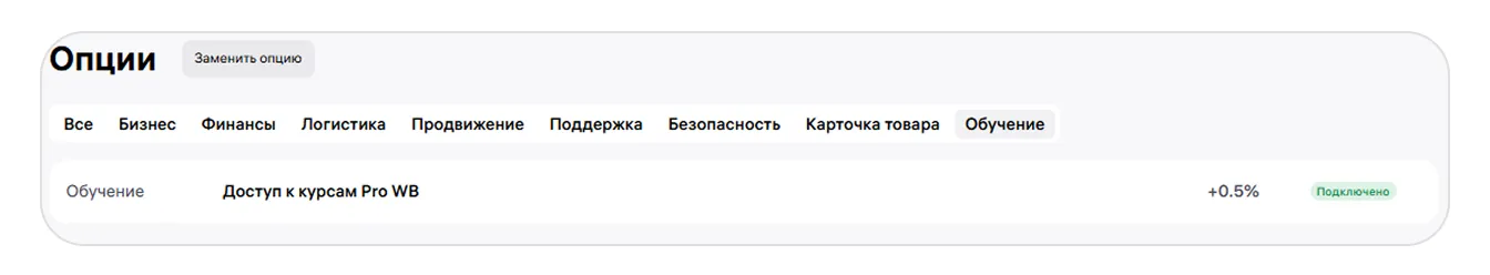 Чтобы получить доступ к платным курсам, подключите опцию «Доступ к курсам Pro WB» в конструкторе тарифов.