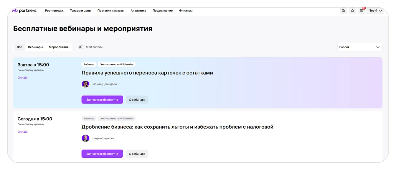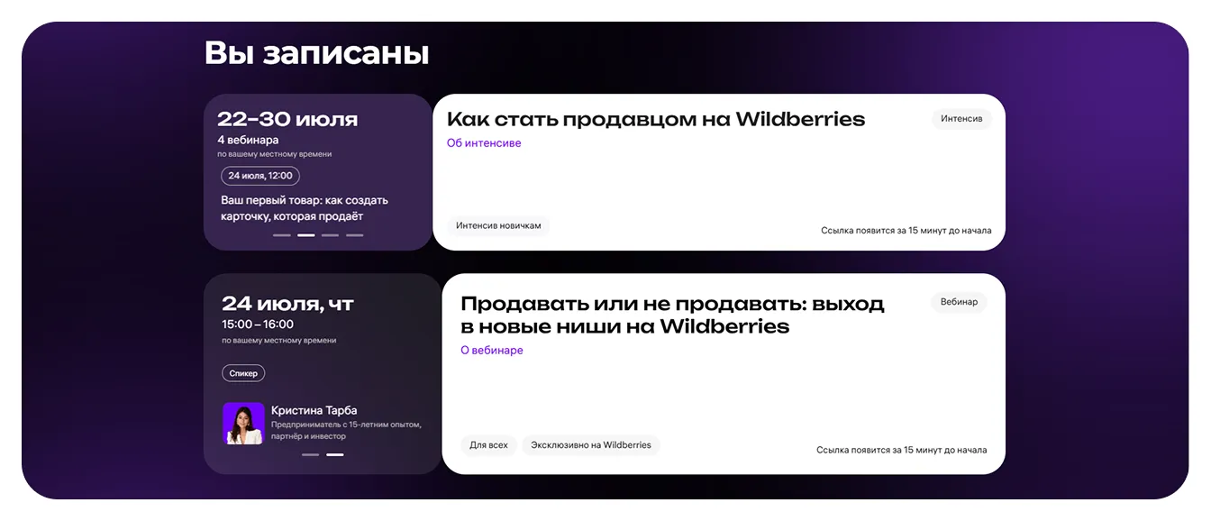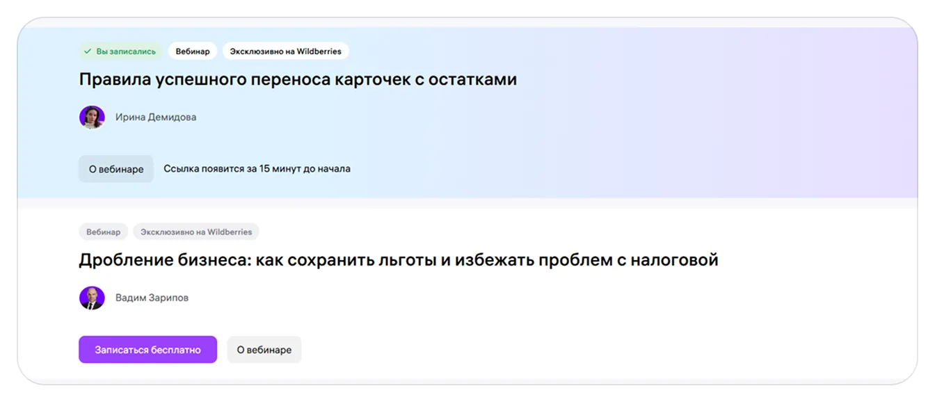 Расписание ближайших вебинаров и офлайн-встреч можно посмотреть в вашем профиле на портале продавцов в разделе «Рост продаж» → «Обучение» → «Календарь мероприятий» или на сайте PRO WB в разделе «Обучение» → «Интенсивы, вебинары и мероприятия». Там же вы можете записаться на них.