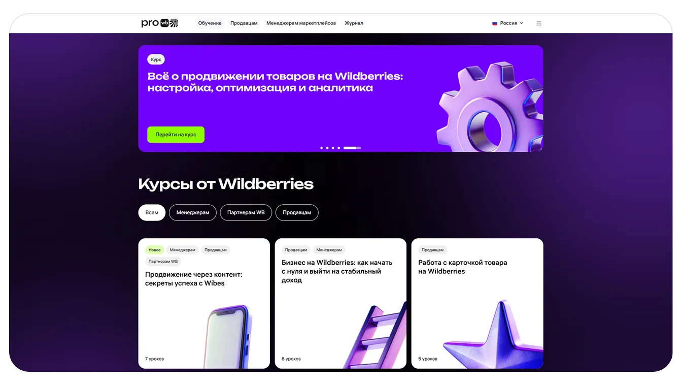 Кликните на раздел «Обучение» → «Курсы» и выберите интересующий. Для удобства воспользуйтесь фильтром по темам — выберите «Менеджерам», «Партнёрам WB» или «Продавцам».