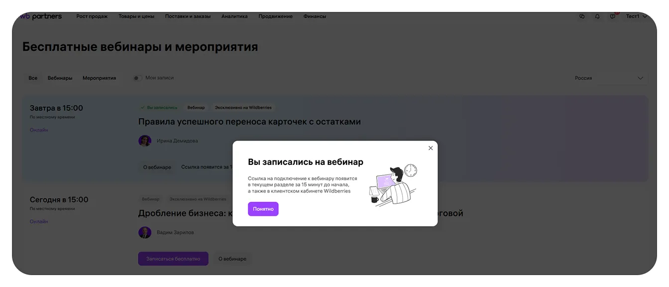 Когда запишетесь на встречу, на экране появится уведомление «Вы записались на вебинар», а на её карточке — отметка «Вы записались».