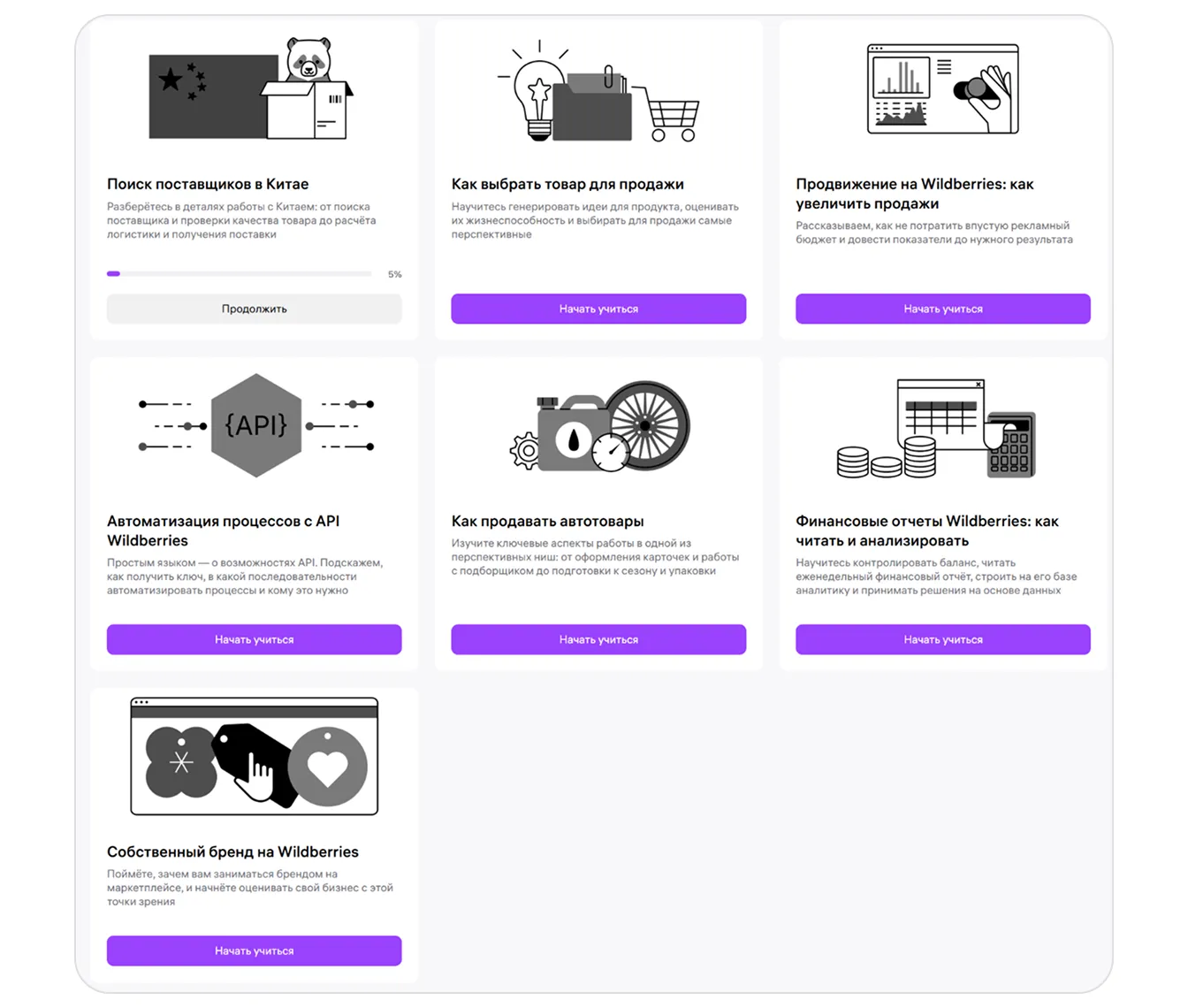 Курсы на портале продавца «WB Партнёры». Эта группа включает бесплатные и платные материалы, которые помогают улучшать свои навыки и бизнес-показатели. Например, изучить ключевые аспекты работы с автотоварами, разобраться в работе с Китаем и узнать, как повысить значимость бренда для бизнеса и покупателей. Полученные знания можно применять не только на Wildberries, но и в сфере e-commerce в целом.