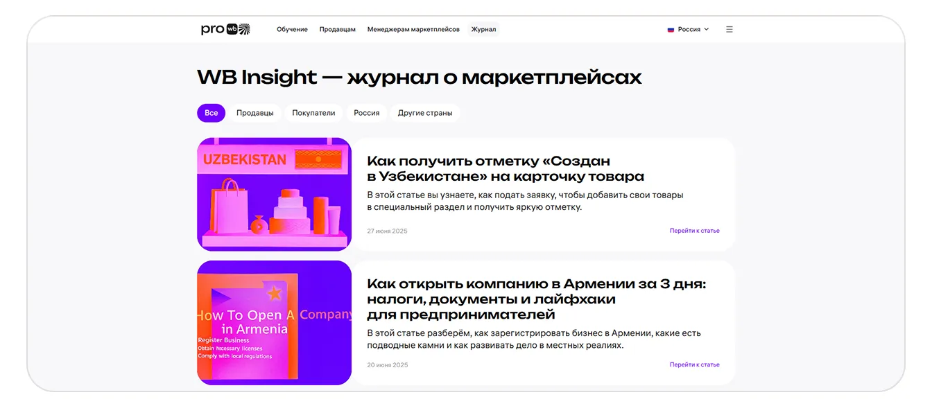 Все статьи можно читать на сайте PRO WB. На главной странице сайта выберите «Журнал». Статьи расположены в хронологическом порядке. Для удобства можно использовать фильтр по темам и локациям — выбрать «Продавцы», «Покупатели», «Россия» или «Другие страны».