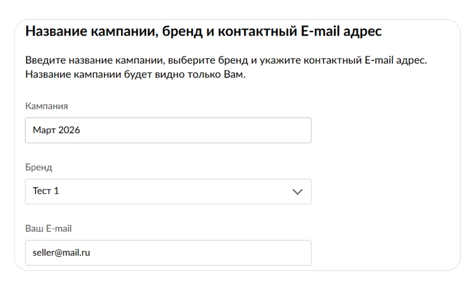 Шаг 2. Укажите название кампании, бренд и свой e-mail