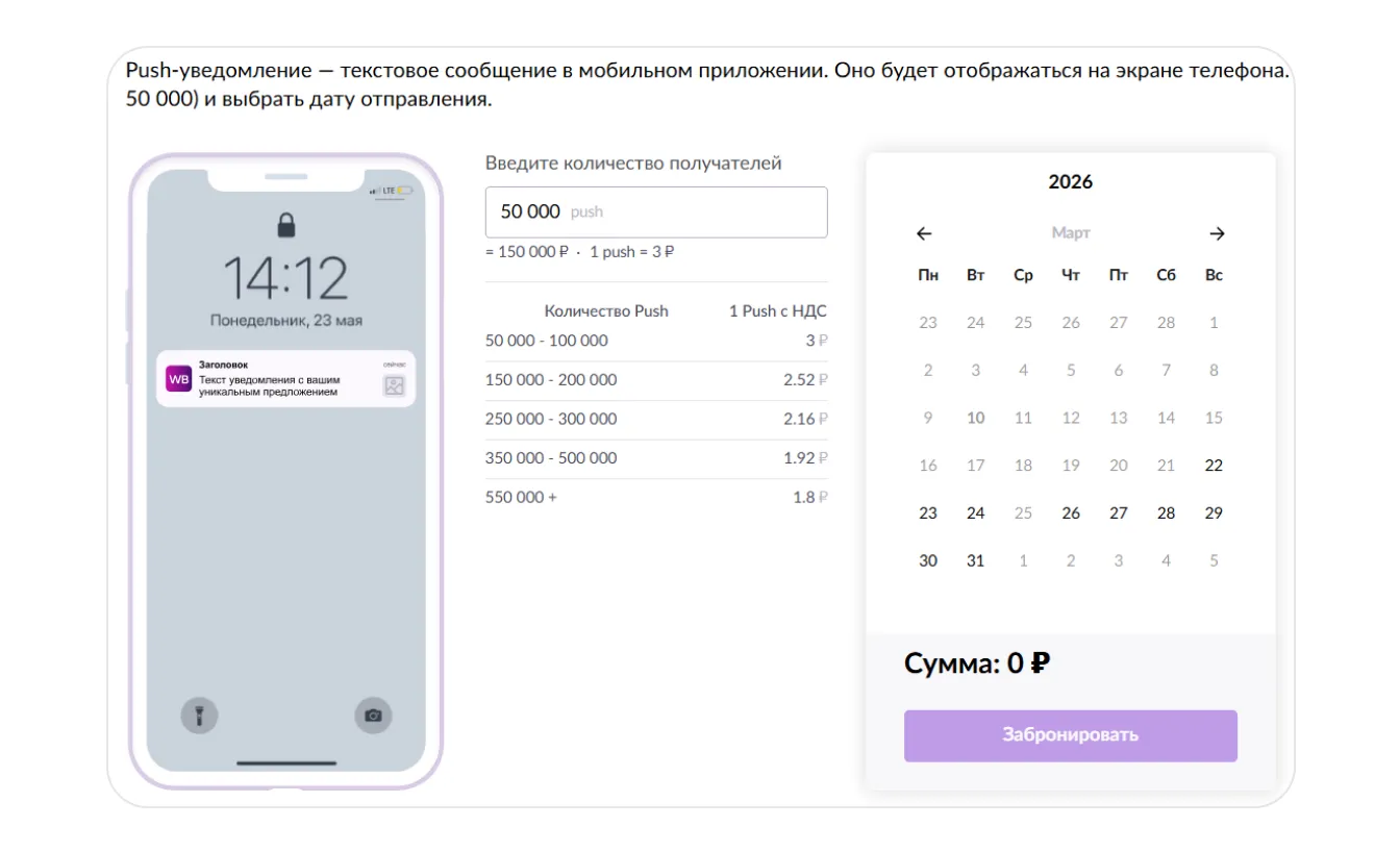 Нажмите «Пуш-уведомление» и укажите количество покупателей. Сразу под полем с числом получателей вы увидите стоимость рассылки.