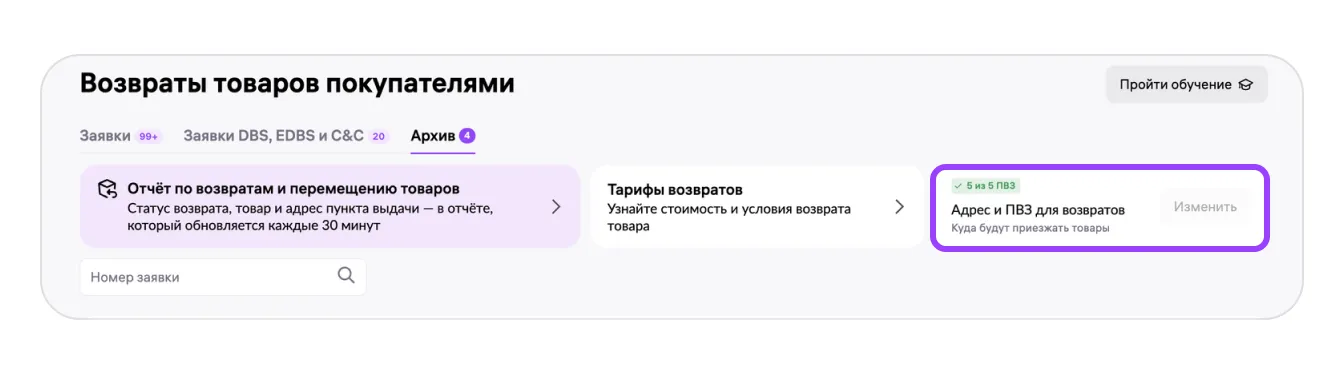 Откройте на портале: Товары и цены → Возвраты покупателей → вкладка «Заявки» или «Заявки только по DBS».