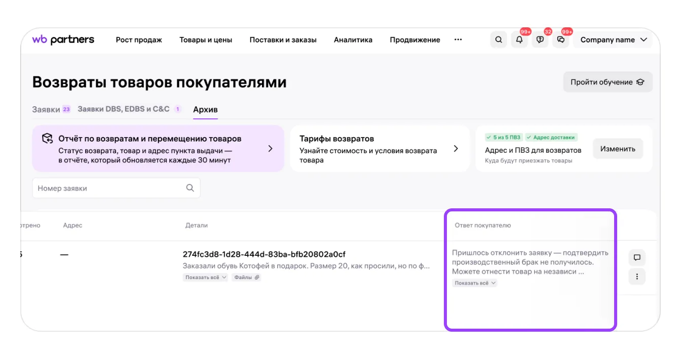 Если вы отказали в возврате, а затем передумали, вы можете один раз изменить решение. Чтобы это сделать, откройте на портале: Товары и цены → Возвраты покупателей → вкладка «Архив». Нажмите на 3 точки справа от заявки и измените ответ. Изменить выбор можно в течение 90 дней после первого решения по заявке, пока она отображается во вкладке «Архив».