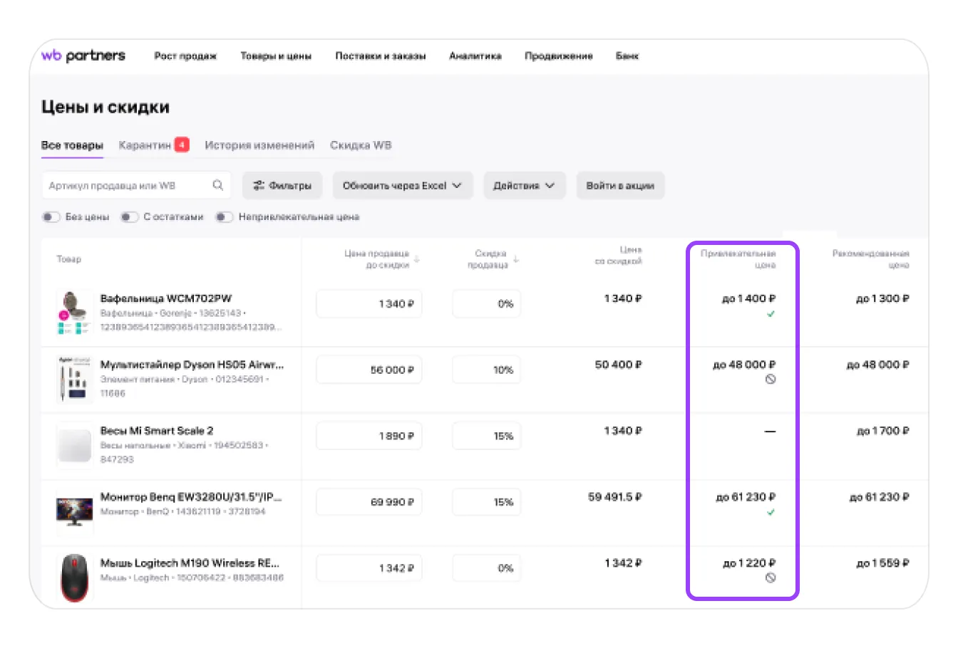 Привлекательная цена рассчитывается отдельно для каждой карточки товара и отображается в одноимённом столбце в разделе «Цены и скидки». Она может пересматриваться периодически. Вы можете самостоятельно отслеживать её изменения в этом разделе.