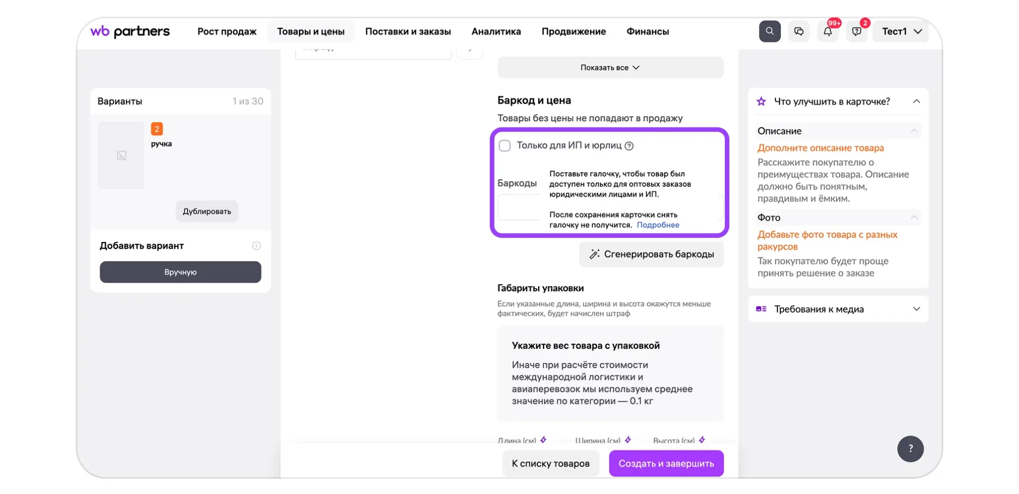 Функциональность, которую мы описываем в этой инструкции, позволяет продавать товары только юрлицам и ИП. Физические лица увидят такие товары на Wildberries, но не смогут их заказать