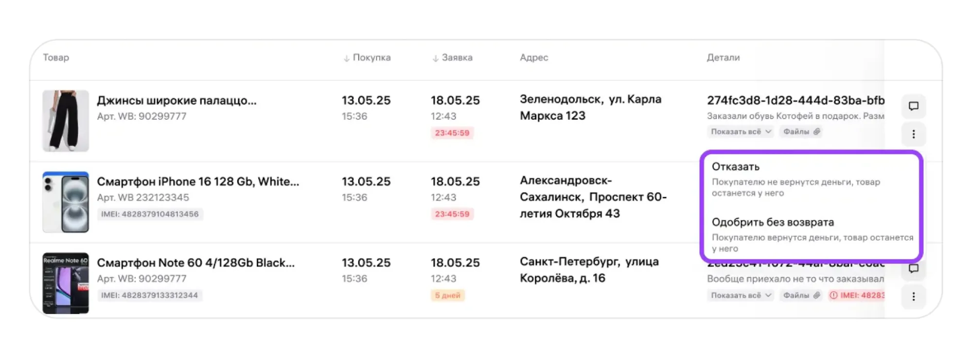 Нажмите «Отказать», если товар соответствует описанию, и вы не видите оснований для возврата.