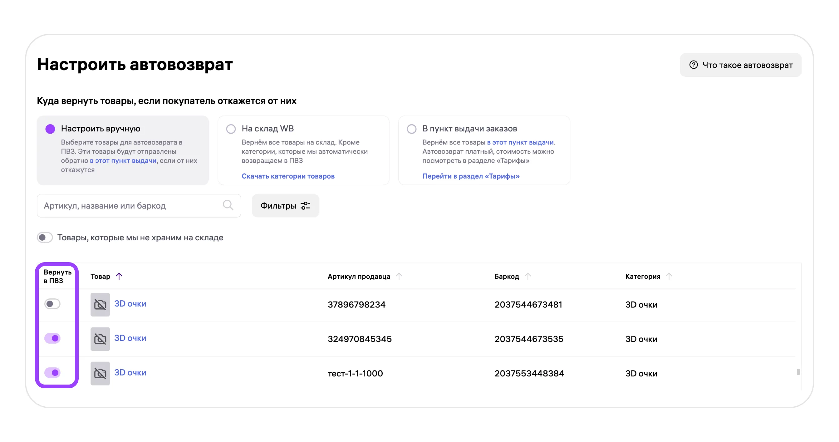Чтобы подключить или отключить автовозврат конкретному товару, выберите «Настроить вручную» — появится список товаров, доступных для возврата. Нажмите переключатель «Вернуть в ПВЗ».