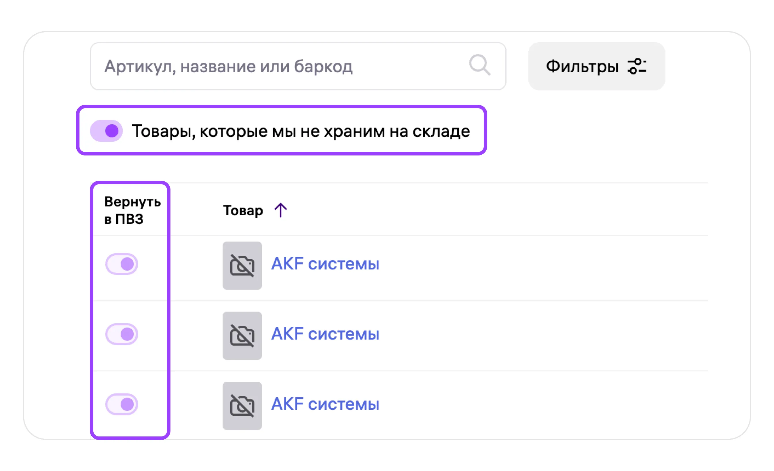 Чтобы увидеть товары, которые можно вернуть только в пункт выдачи, нажмите переключатель «Товары, которые мы не храним на складе». Для таких товаров автоматически выбран вариант «Вернуть в ПВЗ», отключить его не получится.