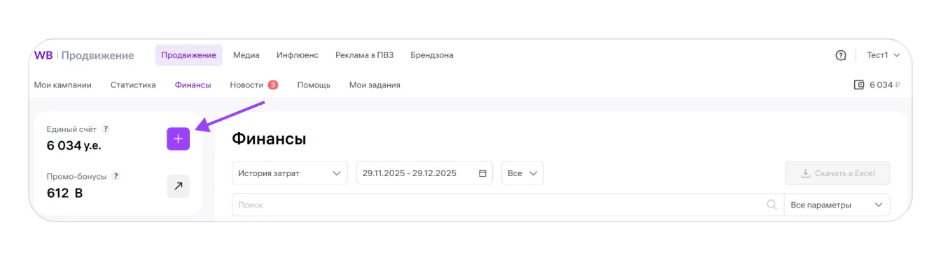 Вы предварительно вносите деньги на счёт кабинета WB Продвижение и используете их для оплаты кампаний. Деньги отображаются на едином счёте.