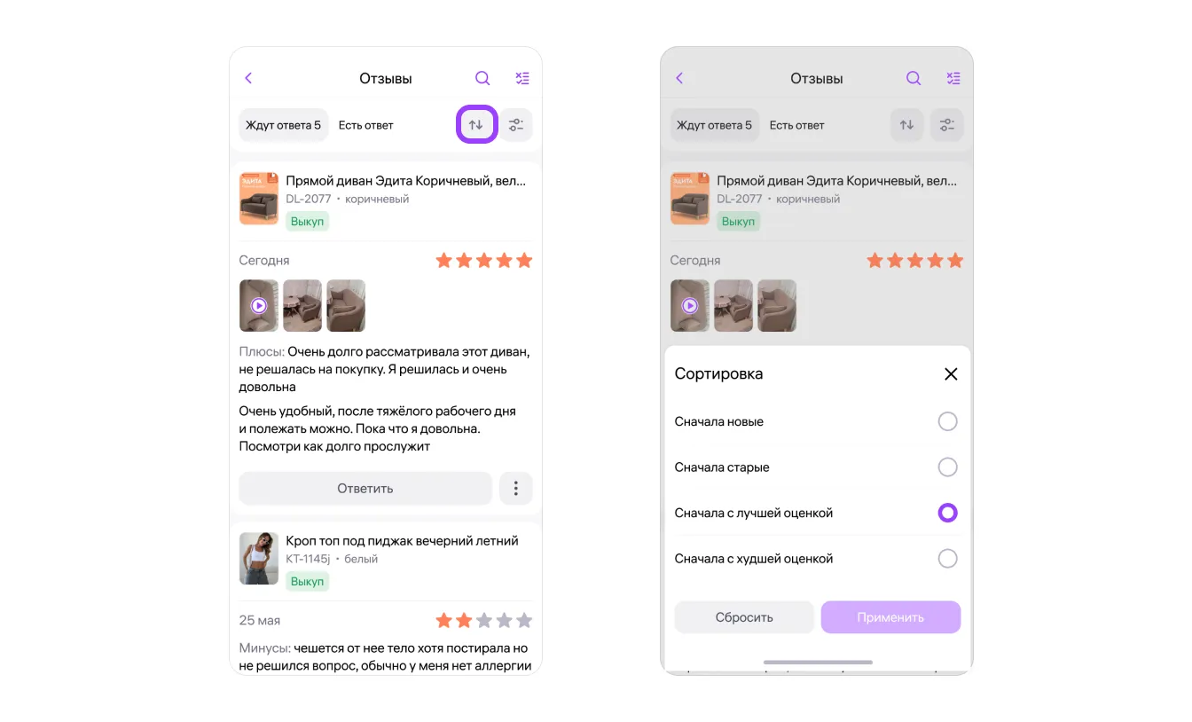Чтобы сортировать отзывы, нажмите значок со стрелками в правом верхнем углу. Выберите сортировку и нажмите «Применить».