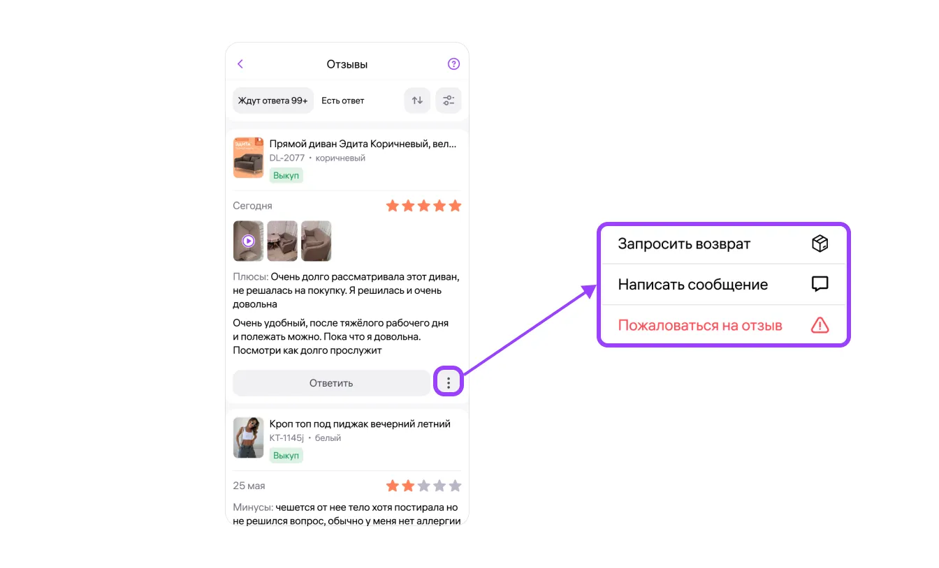 • Есть ответ — сюда сразу попадают отзывы, которые состоят только из оценки товара, а также все остальные отзывы после того, как вы ответите на них, и те, на которые вы пожаловались.