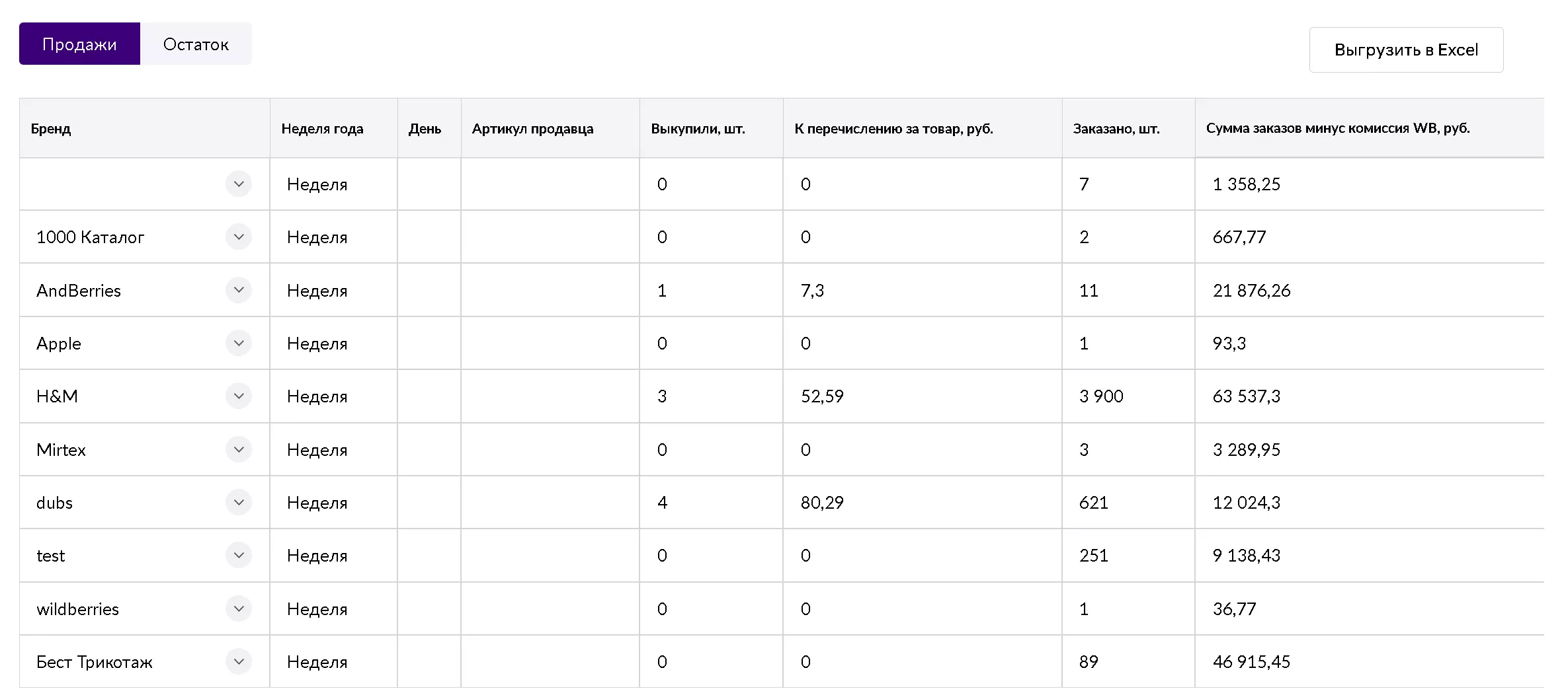 Данные также можно отфильтровать по брендам и складам и задать нужный период времени.
