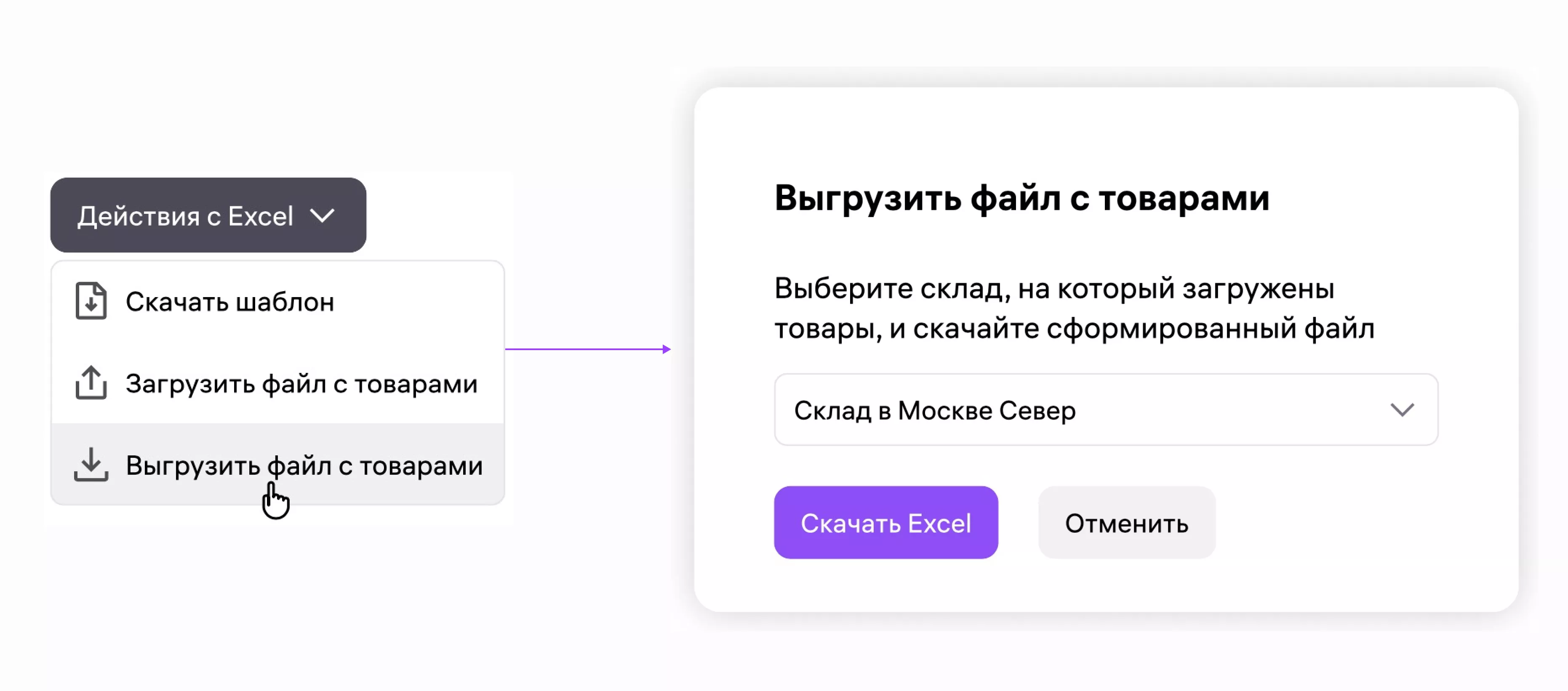 Чтобы выгрузить остатки по одному из складов, нажмите Действия с Excel → Выгрузить файл с товарами. В открывшемся окне выберите склад и нажмите «Скачать Excel».