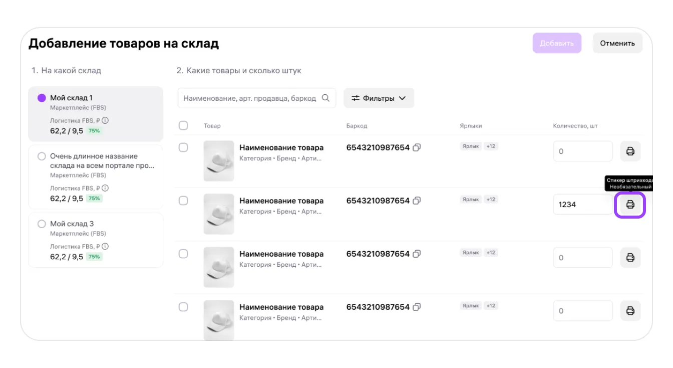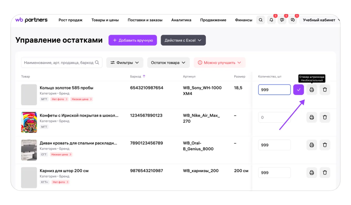 Нажмите кнопку печати стикера баркода справа от строки — стикер сгенерируется в PDF, и вы сможете распечатать столько копий, сколько потребуется.