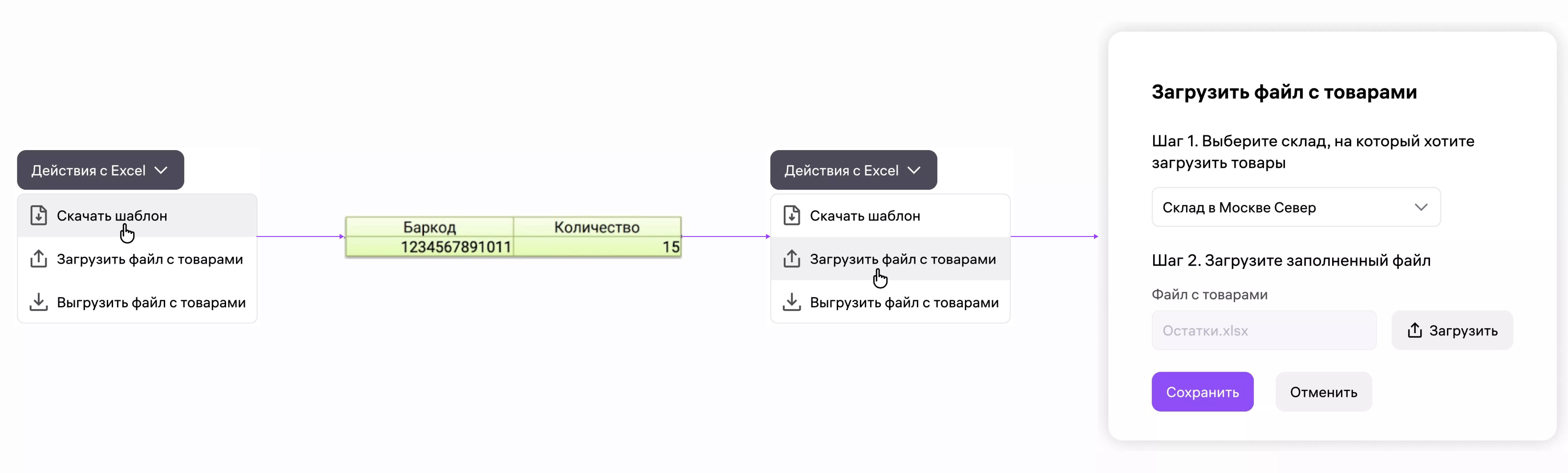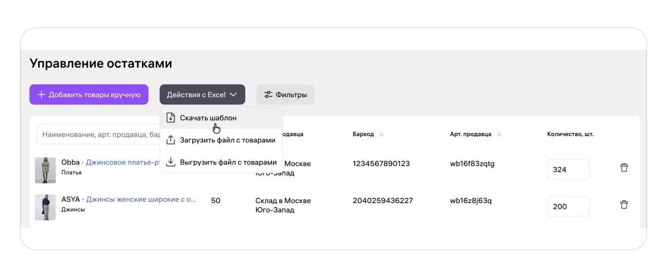 Вы можете загрузить остатки вручную или через XLSX-шаблон.
