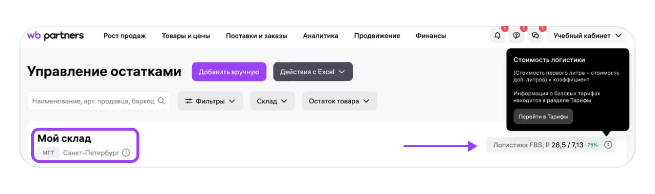 В правом верхнем углу — актуальная стоимость логистики на каждом складе.