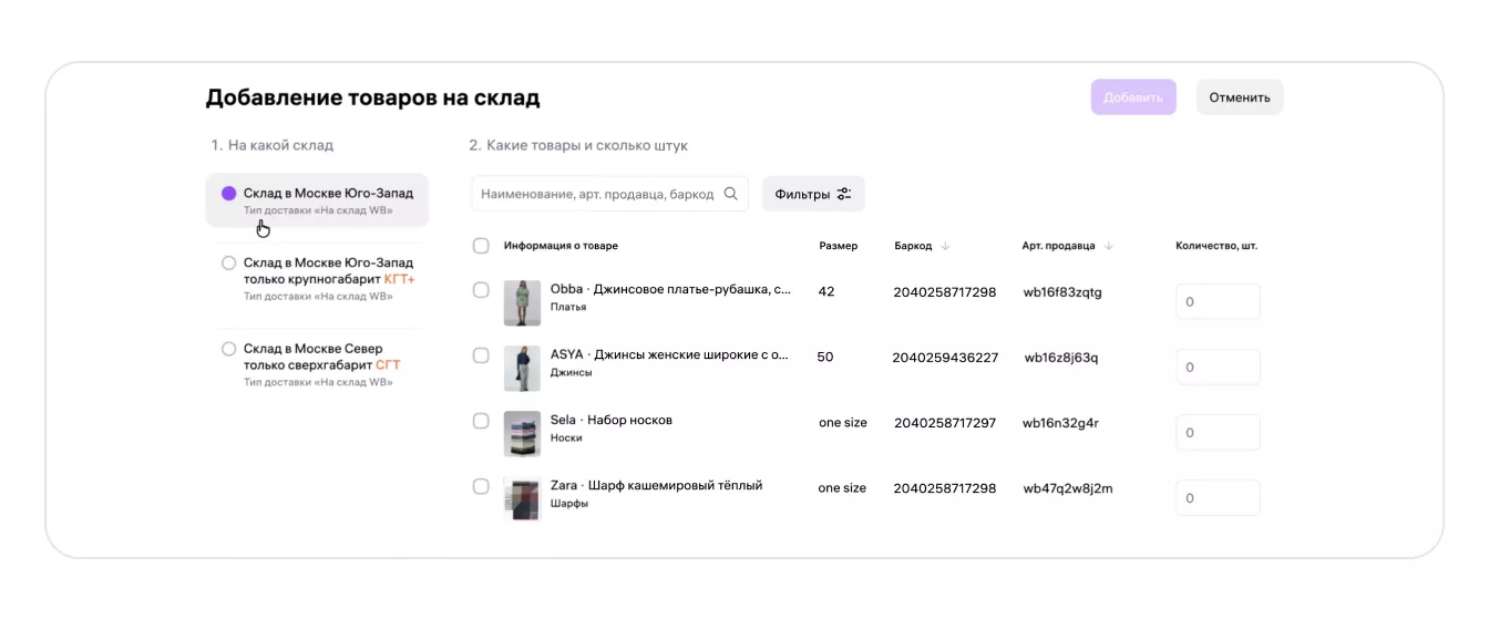 Далее выберите склад в списке слева и проставьте галочки рядом с товарами, которые хотите добавить. В колонке справа укажите количество.