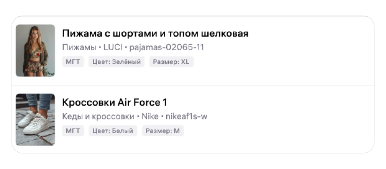 Информация о товарах представлена в виде таблицы. В первой колонке — название товара и его основные характеристики: категория, бренд, цвет и размер.