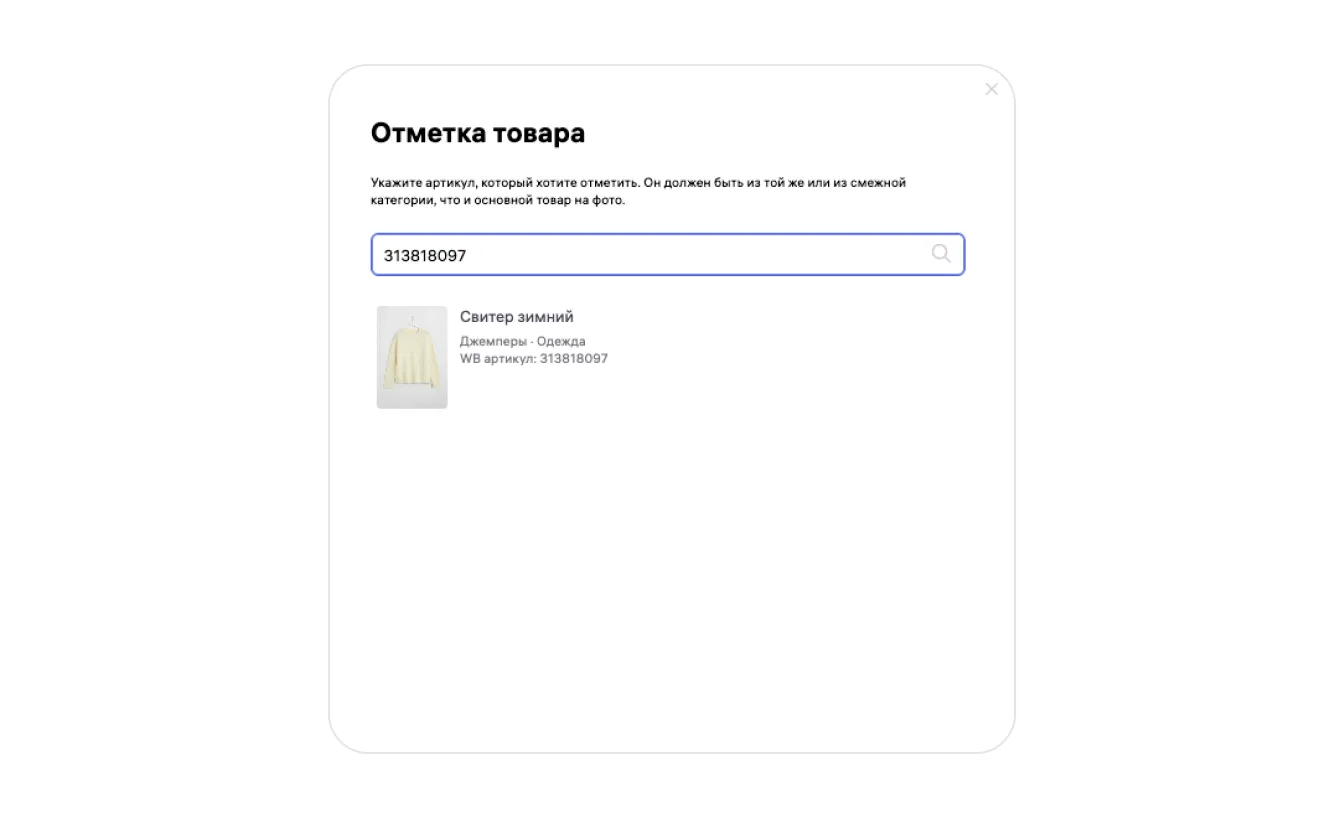 Шаг 5. Если вы добавили отметку самостоятельно, после выбора области откроется окно. Выберите в нём товар, который хотите привязать к отметке. Быстро найти товар можно по артикулу Wildberries в поле поиска.