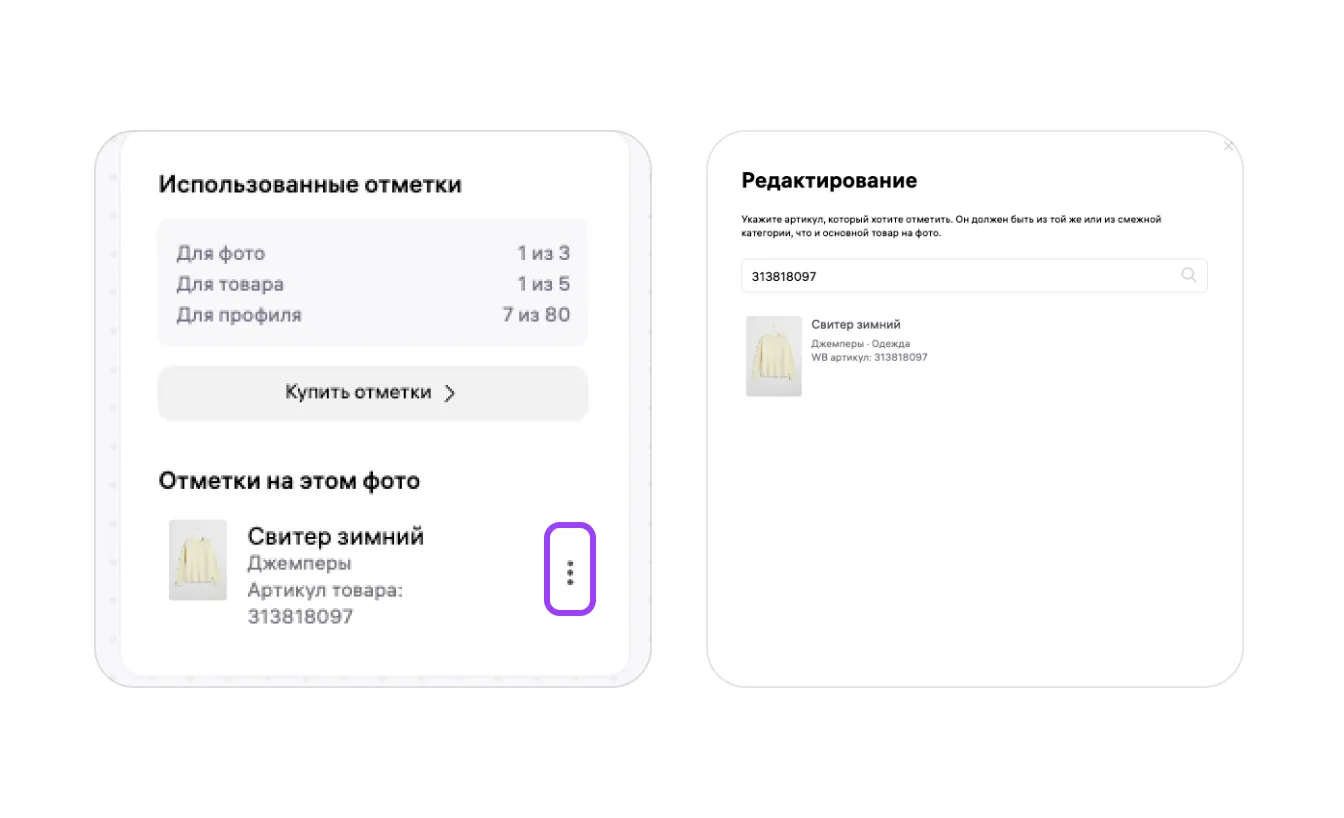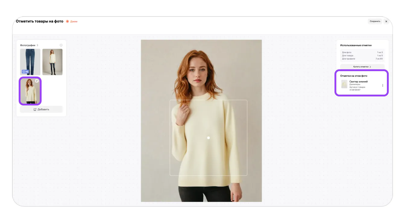 Для продавцов отметки на фото — инструмент увеличения продаж. Они помогают приводить дополнительный трафик на другие ваши карточки и увеличивать их просмотры.