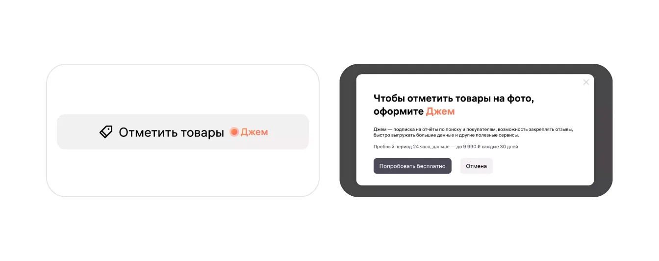 Добавить отметки на фото можно только в уже созданных карточках товара и только, если у вас есть подписка «Джем». Если на кнопке «Отметить товары» вы видите значок «Джем», кликнете по нему, чтобы подключить подписку. Если значка нет — вы уже подписаны на «Джем»