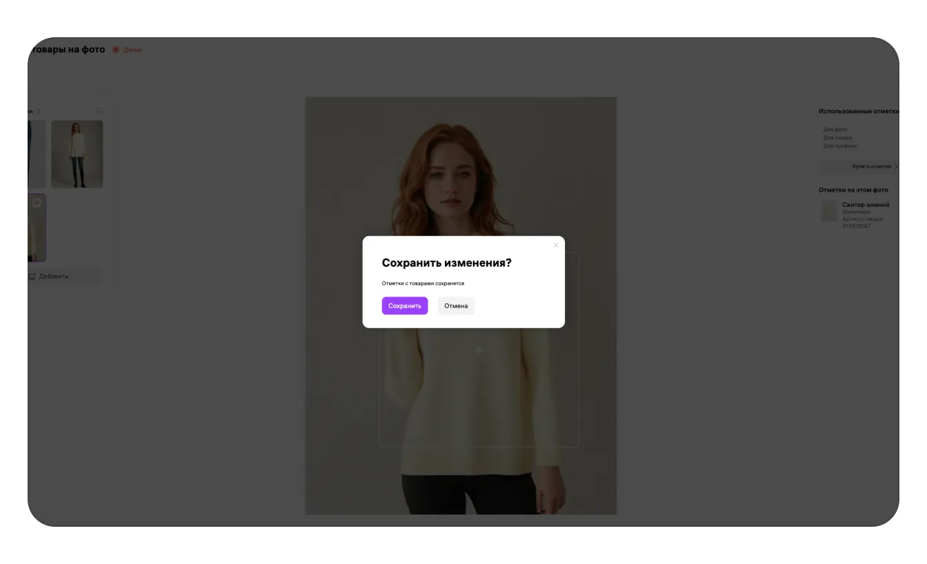 Ещё отметки напрямую влияют на увеличение среднего чека — отмечая несколько товаров на одной фотографии, вы привлекаете внимание покупателей к смежным товарам. А значит, их вероятнее добавят в корзину и купят